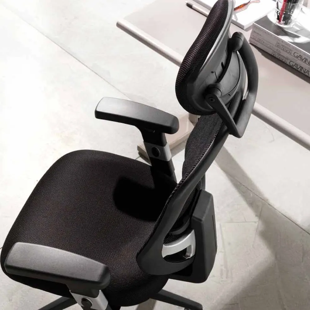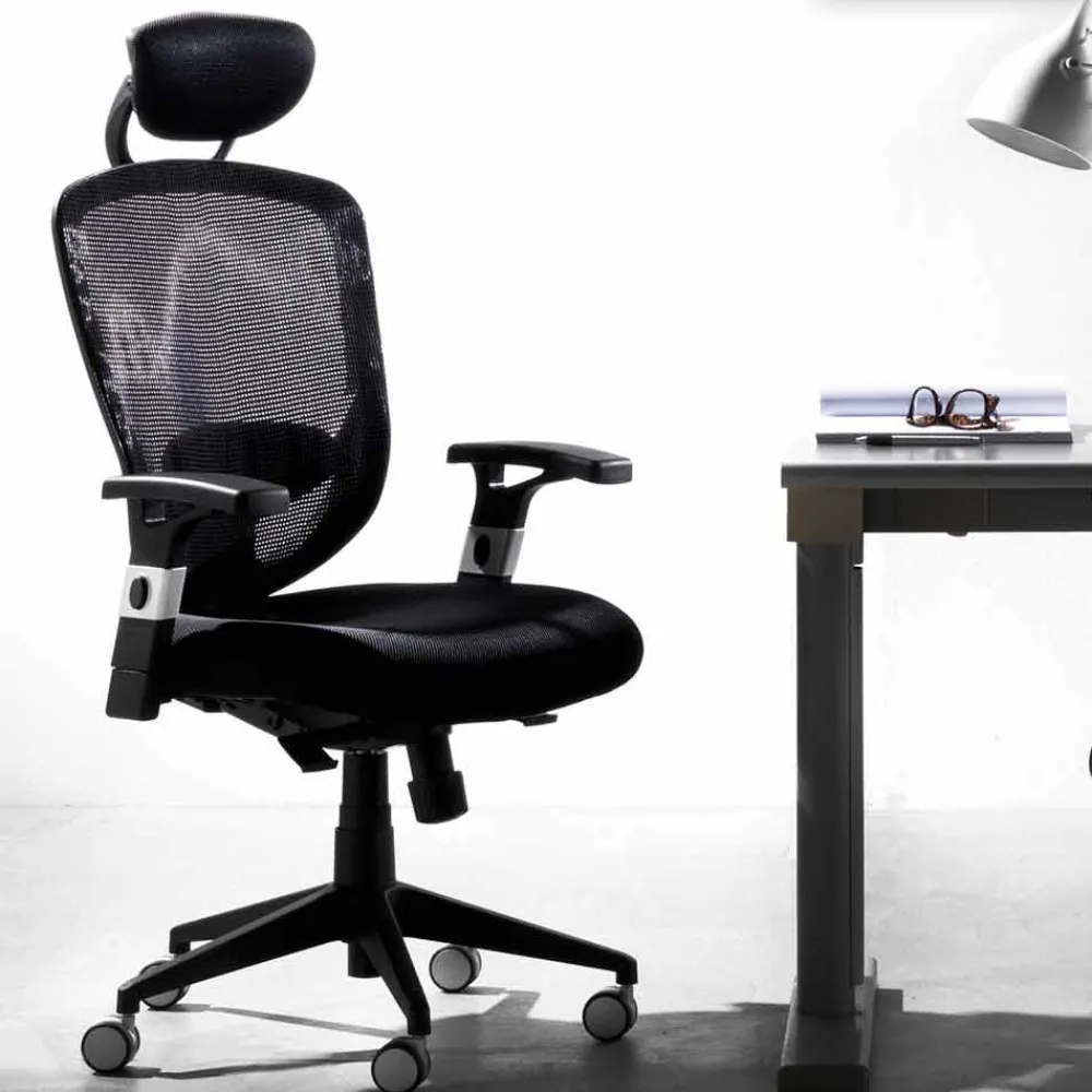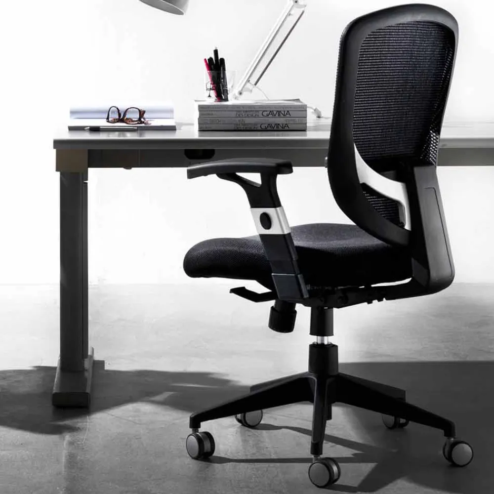 Moderner Drehstuhl aus schwarzem, mikroperforiertem Netz und schwarzer Nylonstruktur.