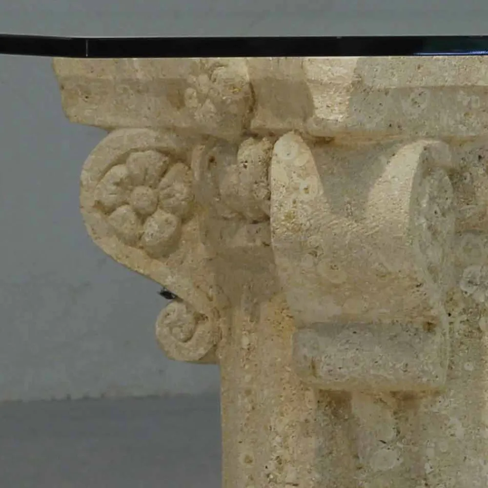 Die Basis ist aus Naturstein aus Vicenza hergestellt und wird von Hand bearbeitet. Die Tischplatte besteht aus Kristall float mit einer Dicke von 12 mm und ist an dem Stein mit einem Flansch befestigt.