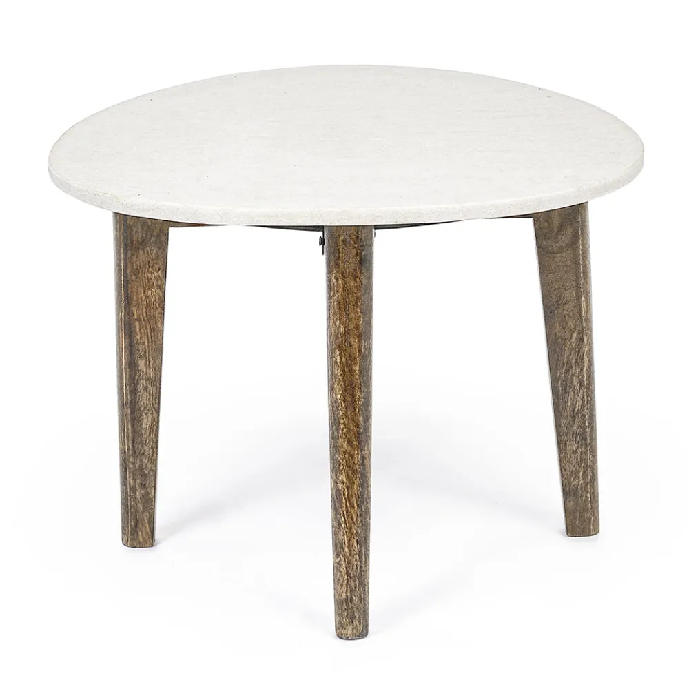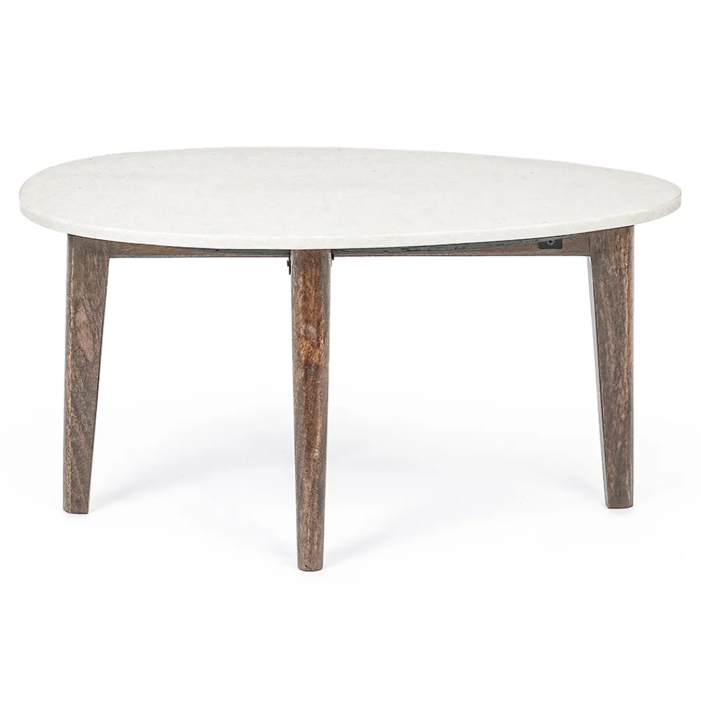 Niedriger Couchtisch aus Mangoholz und Marmorplatte.