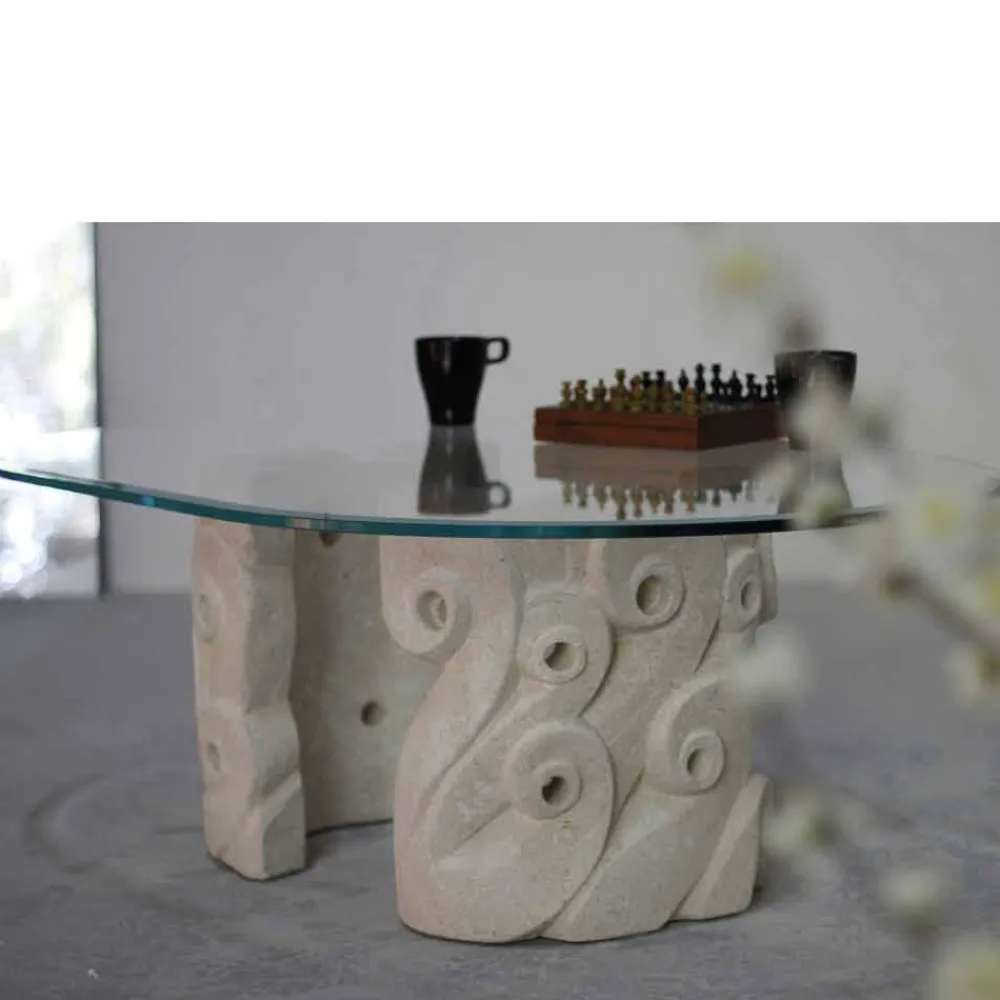 Die Basis ist aus Naturstein aus Vicenza hergestellt und wird von Hand bearbeitet. Die Tischplatte besteht aus Kristall float mit einer Dicke von 12 mm und ist an dem Stein mit einem Flansch befestigt.
