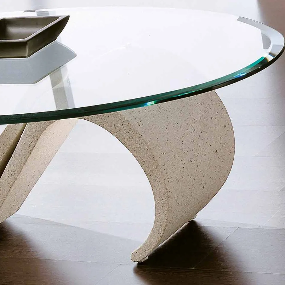 In Italien hergestellter Couchtisch mit ovaler Platte aus abgeschrägtem transparentem Glas und Basis aus Mineralmarmor , einem Material, das durch Mischen von Marmorpulver gewonnen wird. Die Verarbeitung zu 100 % Made in Italy und die Verwendung hochwertiger Rohstoffe erwecken ein einzigartiges Möbelstück zum Leben, das sich durch Eleganz und Kreativität auszeichnet. Der Sockel aus mineralischem Marmor verleiht dem Couchtisch eine hervorragende Festigkeit und Robustheit und verleiht seiner Ästhetik eine exklusive und äußerst elegante Note . Seine besondere Form erinnert an eine Welle und verleiht dem Produktdesign Bewegung und eine wunderbare Harmonie mit den weichen Linien der Glasplatte. Dank der neutralen und diskreten Oberflächen ist es auch eine vielseitige Einrichtungslösung , die sich daher an die unterschiedlichsten häuslichen Kontexte anpassen kann und eine exklusive und avantgardistische Persönlichkeit mit sich bringt.