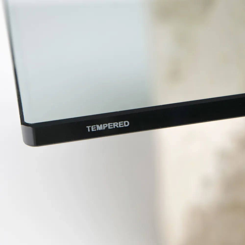 Couchtisch mit weißer Fossilsteinstruktur und 10 mm polierter Glasplatte.