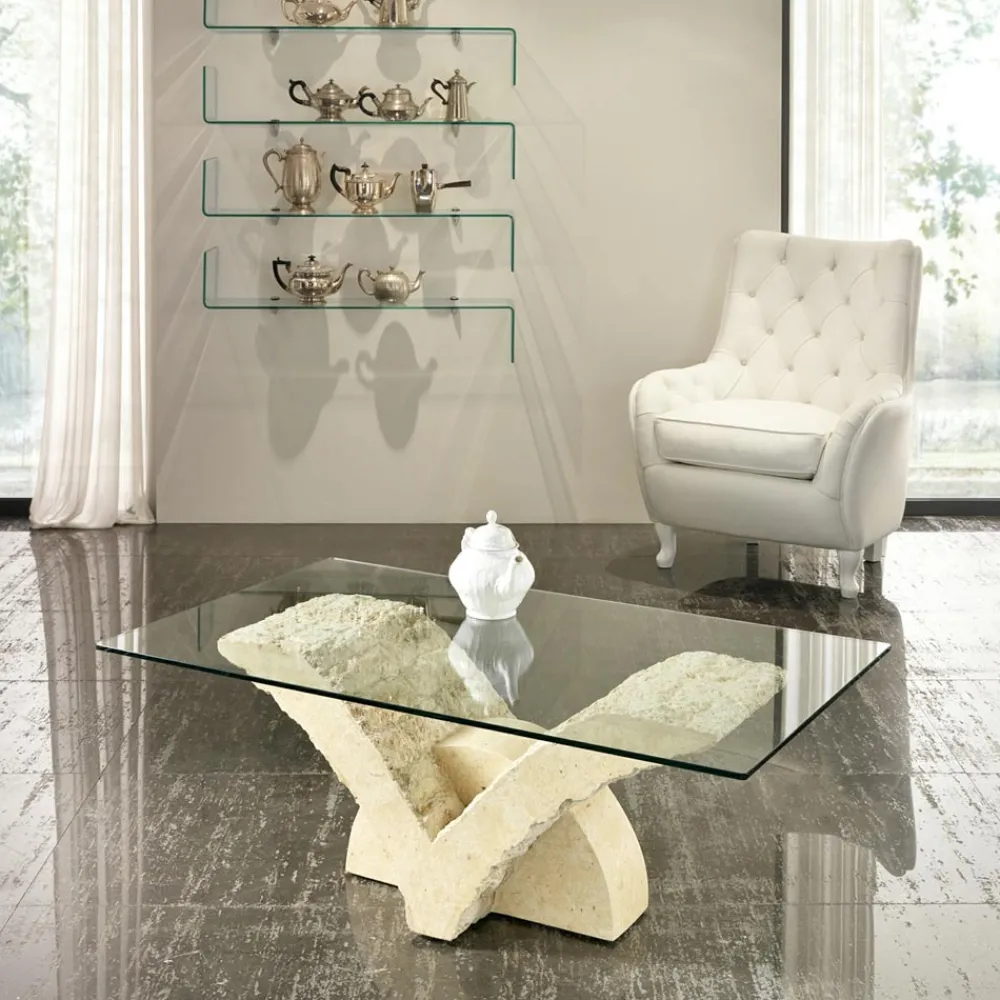 Moderner Couchtisch aus fossilem Stein und Glas.