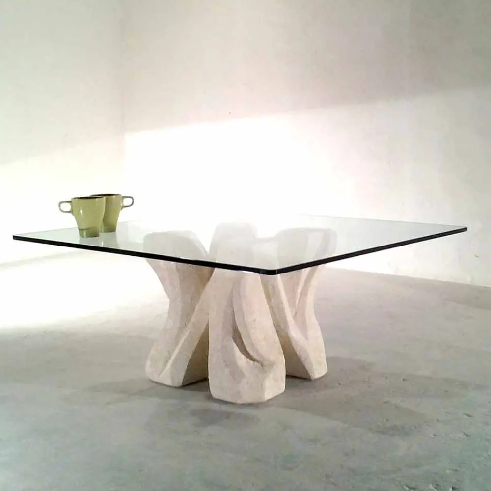 Die Basis ist aus Naturstein aus Vicenza hergestellt und wird von Hand bearbeitet. Die Tischplatte besteht aus Kristall float mit einer Dicke von 12 mm und ist an dem Stein mit einem Flansch befestigt.