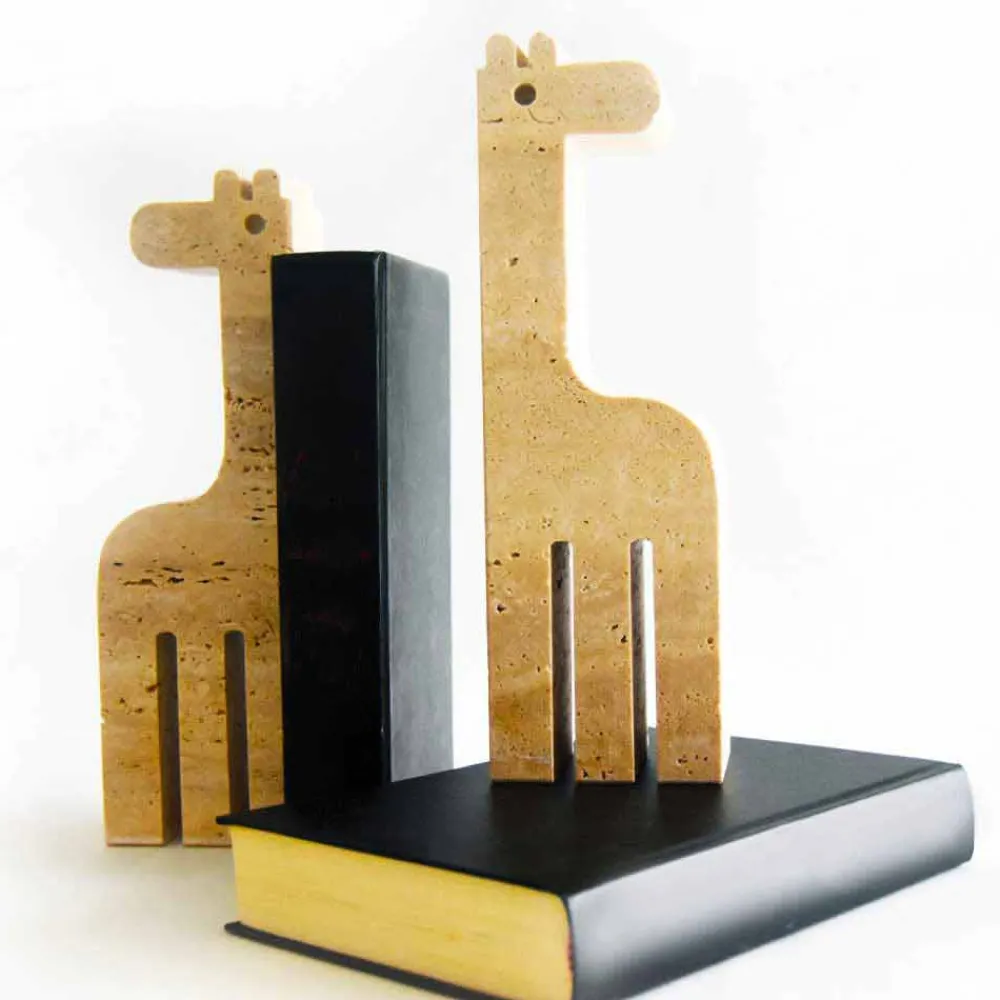 2 Buchstützen aus modernem Design aus Travertinmarmor mit Giraffenform Made in Italy.