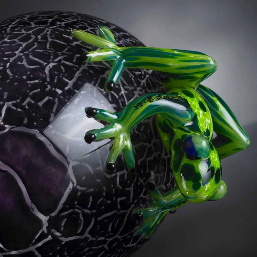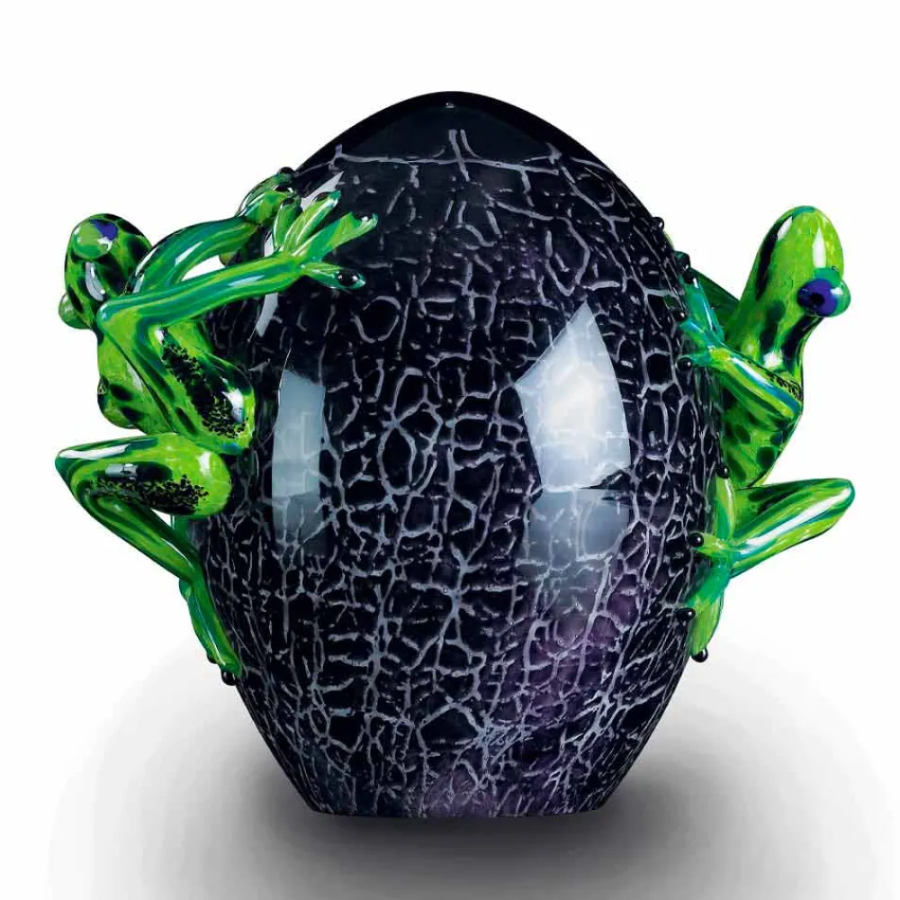 Dekorative Statue in Form von Fröschen auf einem Ei made in Italy aus schwarzem und grünem Glas . Ein Einrichtungsaccessoire mit intrinsischer Eleganz, das die zeitlose Raffinesse von Glas mit hellen und lebendigen Farben verbindet, die dem Produkt eine originelle Note verleihen und seine Wertigkeit und Wertigkeit unterstreichen. Die wundervollen Oberflächen und die neuen und kreativen Formen bereichern dieses Ornament und machen es zu einer perfekten Lösung für diejenigen, die einen kreativen und exzentrischen Stil für ihr Zuhause suchen, der eine exklusive Atmosphäre zum Leben erweckt.