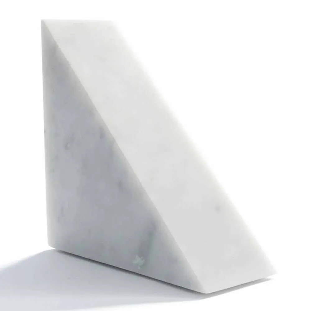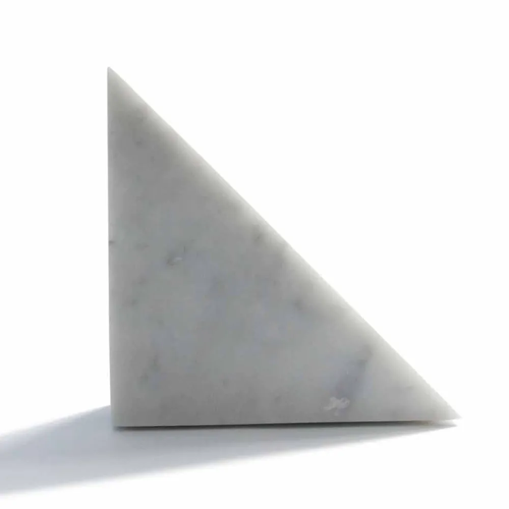 Dreieck Design Buchstütze aus satinweißem Carrara Marmor Made in Italy.