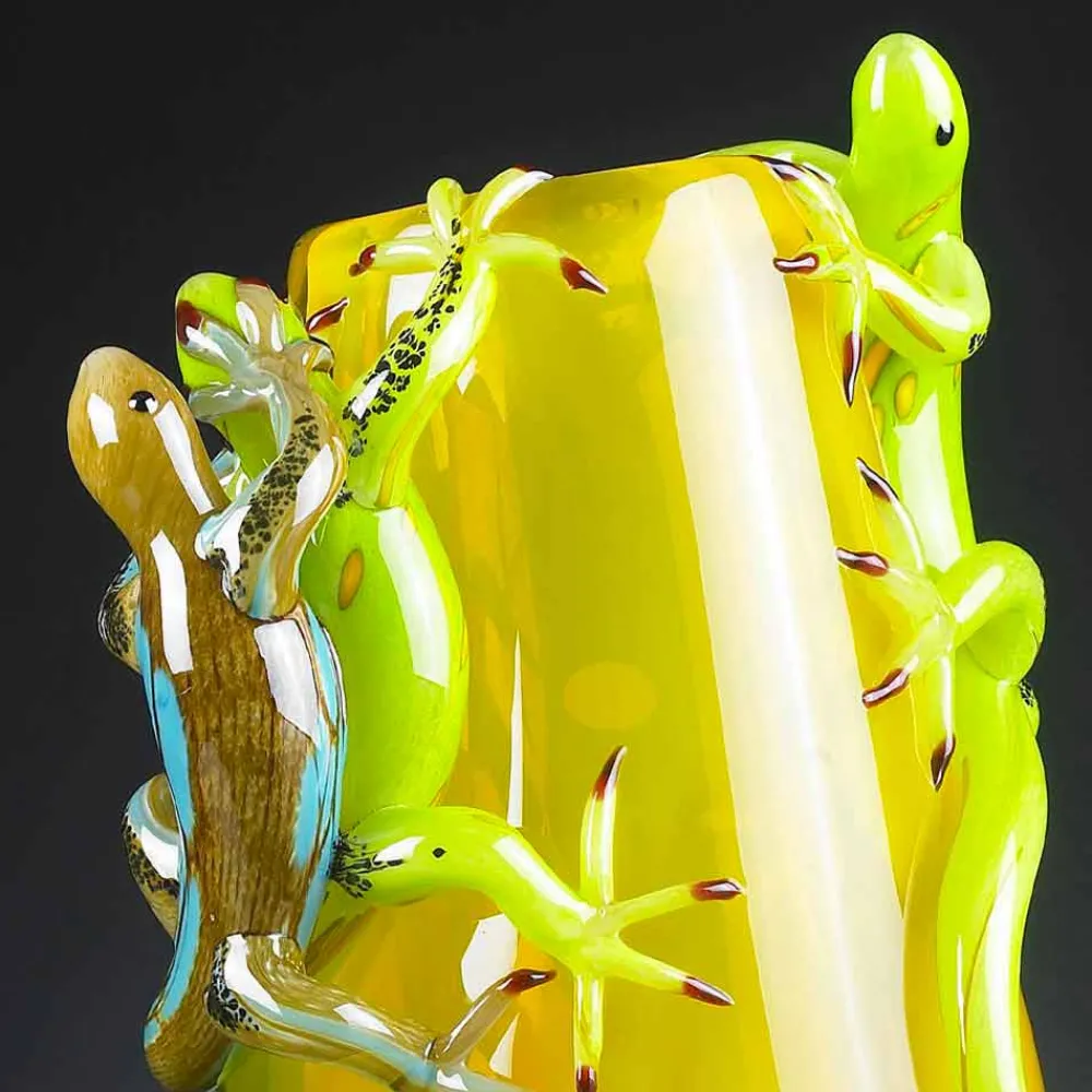 Dekorative Innenvase aus gelbem Glas, handgefertigt in Italien von Glasmachermeistern, die seit Generationen Experten auf dem Sektor sind, bereichert durch 3 Geckos in Grün- und Brauntönen. Seine Besonderheit wird durch die handwerkliche Produktion repräsentiert, die seinen Wert und Wert erhöht, um ein exklusives und hochwertiges Ergebnis zum Leben zu erwecken. Seine farbenfrohe Ästhetik ist zweifellos eine weitere Stärke, die es zu einer perfekten Idee für alle macht, die es lieben, gleichzeitig originell und elegant zu bereichern, dank eines Objekts, das von exklusiven Linien und der zeitlosen Eleganz von Glas und seinen wunderbaren Farben unterstrichen wird.