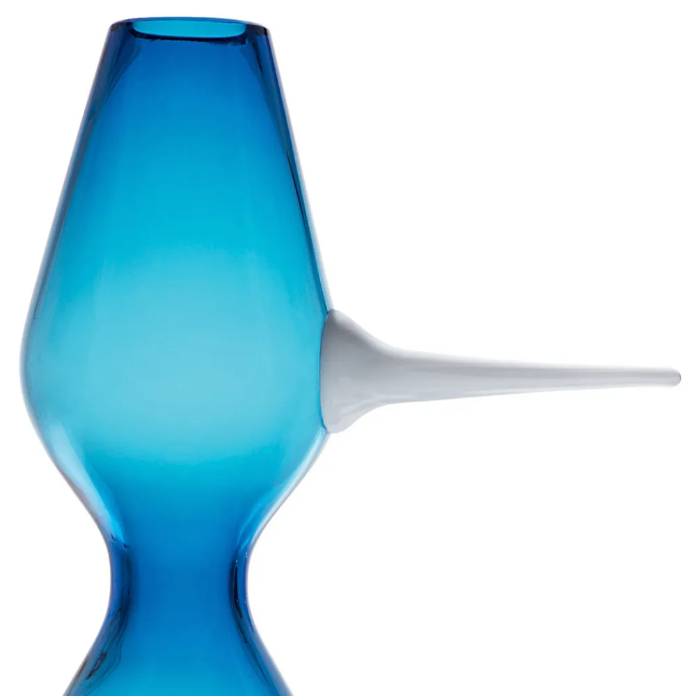 Die Nasenvase wird vollständig von Meistern des Sektors aus blauem mundgeblasenem Murano-Glas handgefertigt, während die Nase aus weißer Glaspaste besteht.