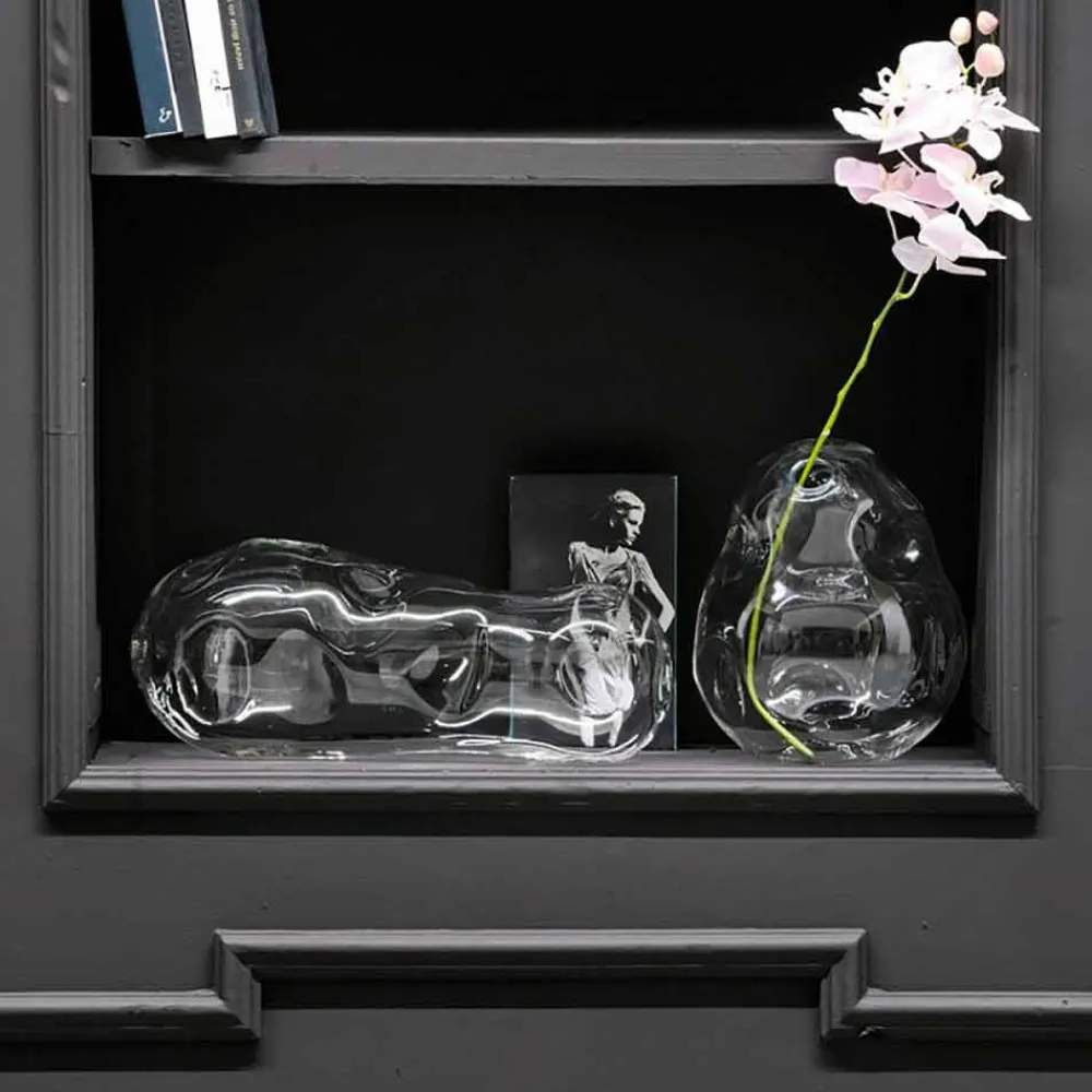 Originelles Paar dekorative Vasen made in Italy aus transparentem mundgeblasenem Glas mit exzentrischem Design. Originalität, Kreativität und Eleganz sind die besonderen Merkmale dieser Komposition moderner Vasen, die sich zu einer äußerst ungewöhnlichen und fantasievollen Einrichtungslösung zusammenfügen . Die Leidenschaft und Erfahrung der Meister des mundgeblasenen Glases ermöglichen es, ein echtes Kunstwerk zu schaffen und seinen Wert noch mehr zu steigern, ist die Tatsache, dass jedes Stück einzigartig und unwiederholbar ist, da es durch kleine Unterschiede gekennzeichnet ist, die es unterstreichen. der Wert. Das Ergebnis ist somit eine Design-Ergänzung , die dank ihrer exklusiven Persönlichkeit und ihres originellen Charakters alle Aufmerksamkeit auf sich zieht.