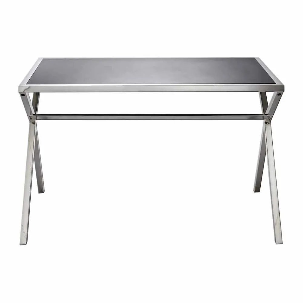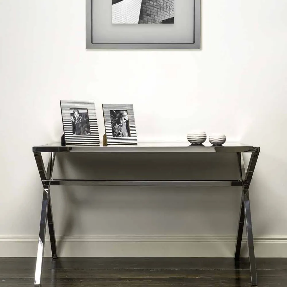 Millon ist ein Schreibtisch mit einfachen und modernen Linien. Die Struktur besteht aus Stahl, während die Oberseite aus glänzendem schwarzem Glas besteht. Dank seines vielseitigen Designs kann es im Wohnbereich oder im Büro installiert werden.