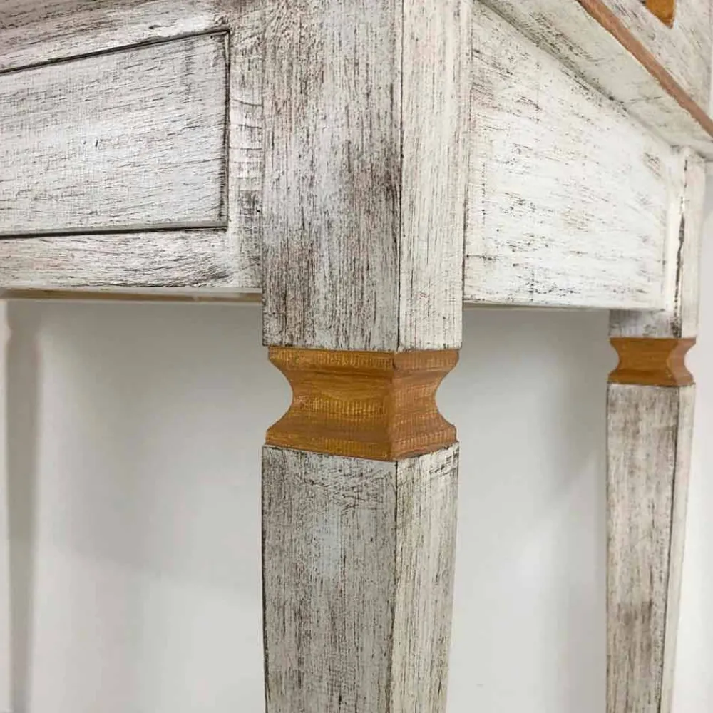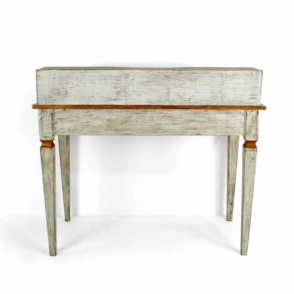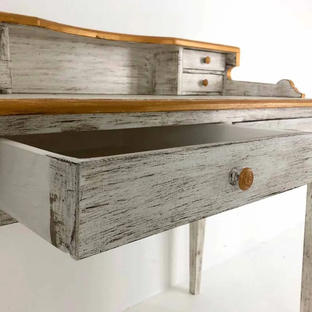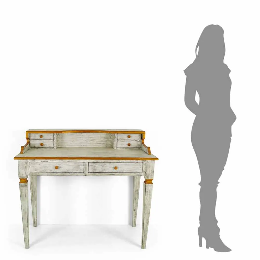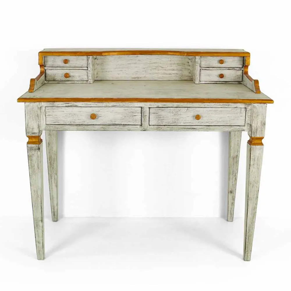 Schreibtisch handgefertigt in Italien aus massivem Tannenholz mit gealterter weißer Oberfläche, angereichert mit Profilen und Details in antikem Gold . Die Struktur verfügt außerdem über einen praktischen, leicht entfernbaren Backsplash , mit dem Sie insgesamt 6 Schubladen erhalten, die sich ideal zum Anordnen und Organisieren Ihrer Objekte eignen.