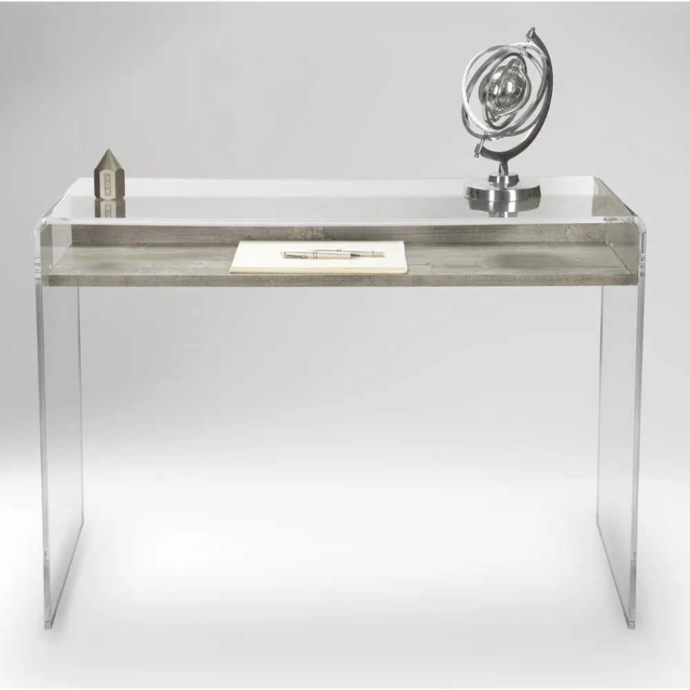 Moderne Designkonsole aus lasergeschnittenem transparentem Plexiglas mit Holzregal, Design made in Italy.