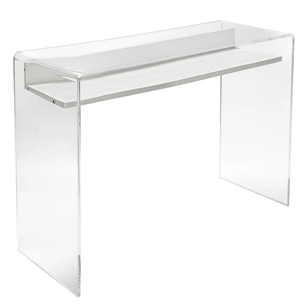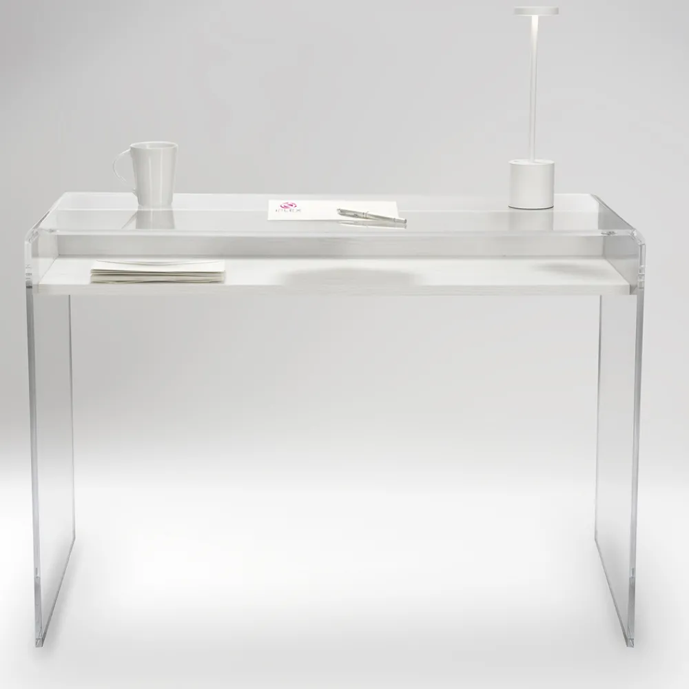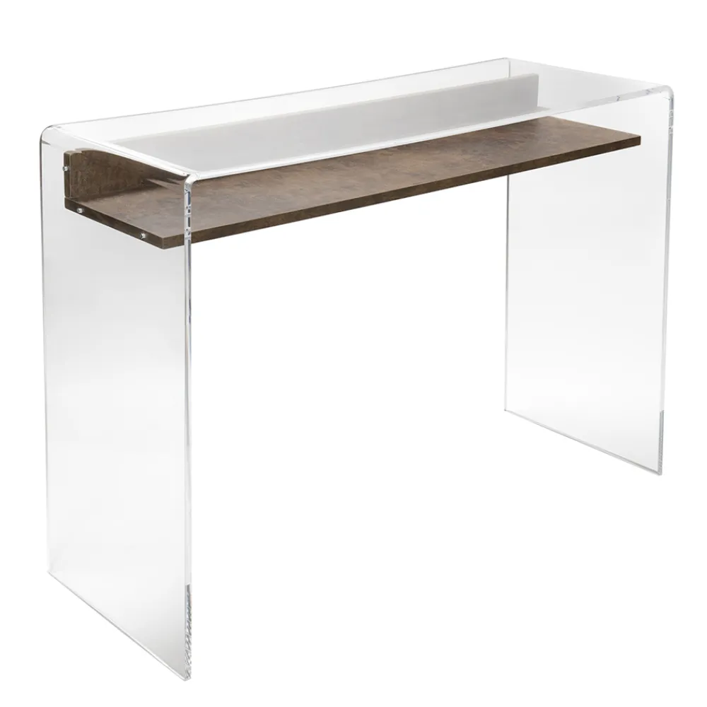 Diese Konsole mit praktischem Design besteht aus 100 % PMMA- Plexiglas aus transparentem, reinem Polymer und wird durch ein Regal aus edlem , veredeltem Holz bereichert.
