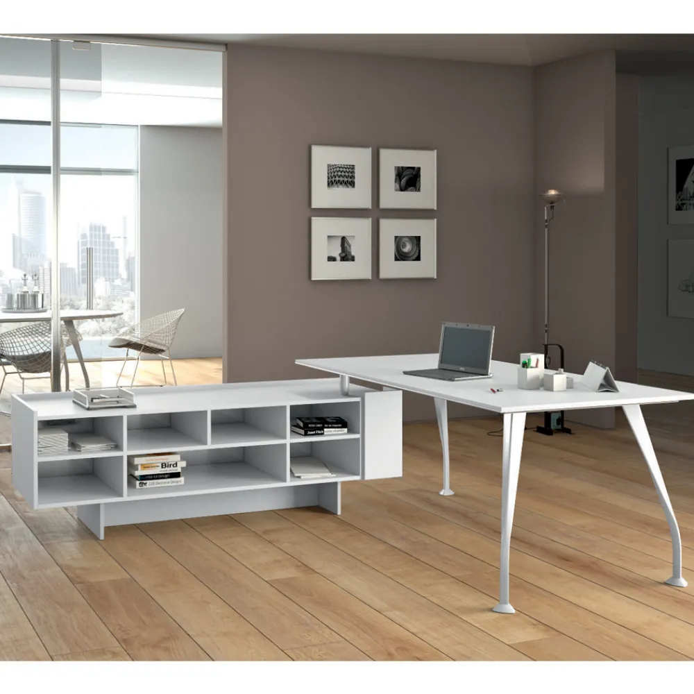 Die Besonderheit dieses Schreibtisches liegt in seiner integrierten offenen Serviceeinheit aus Melamin mit weißer Oberfläche.