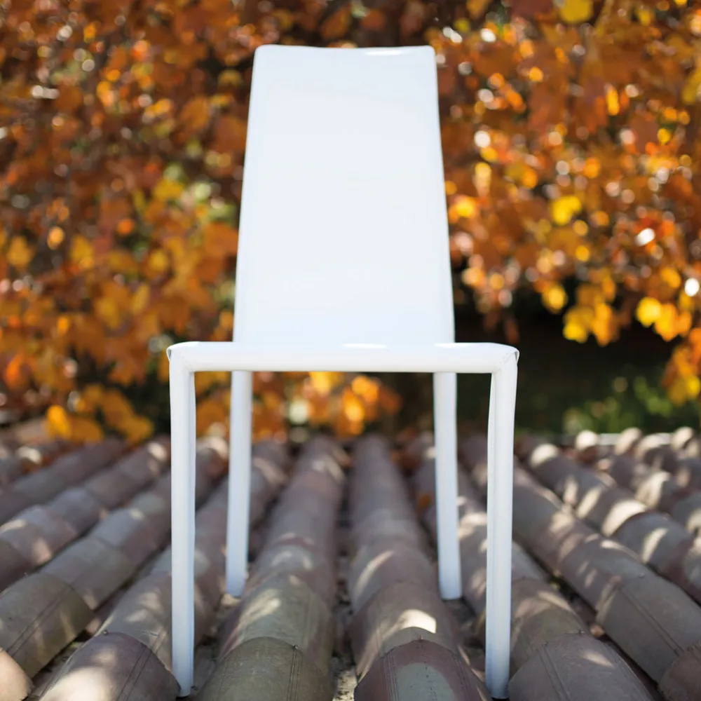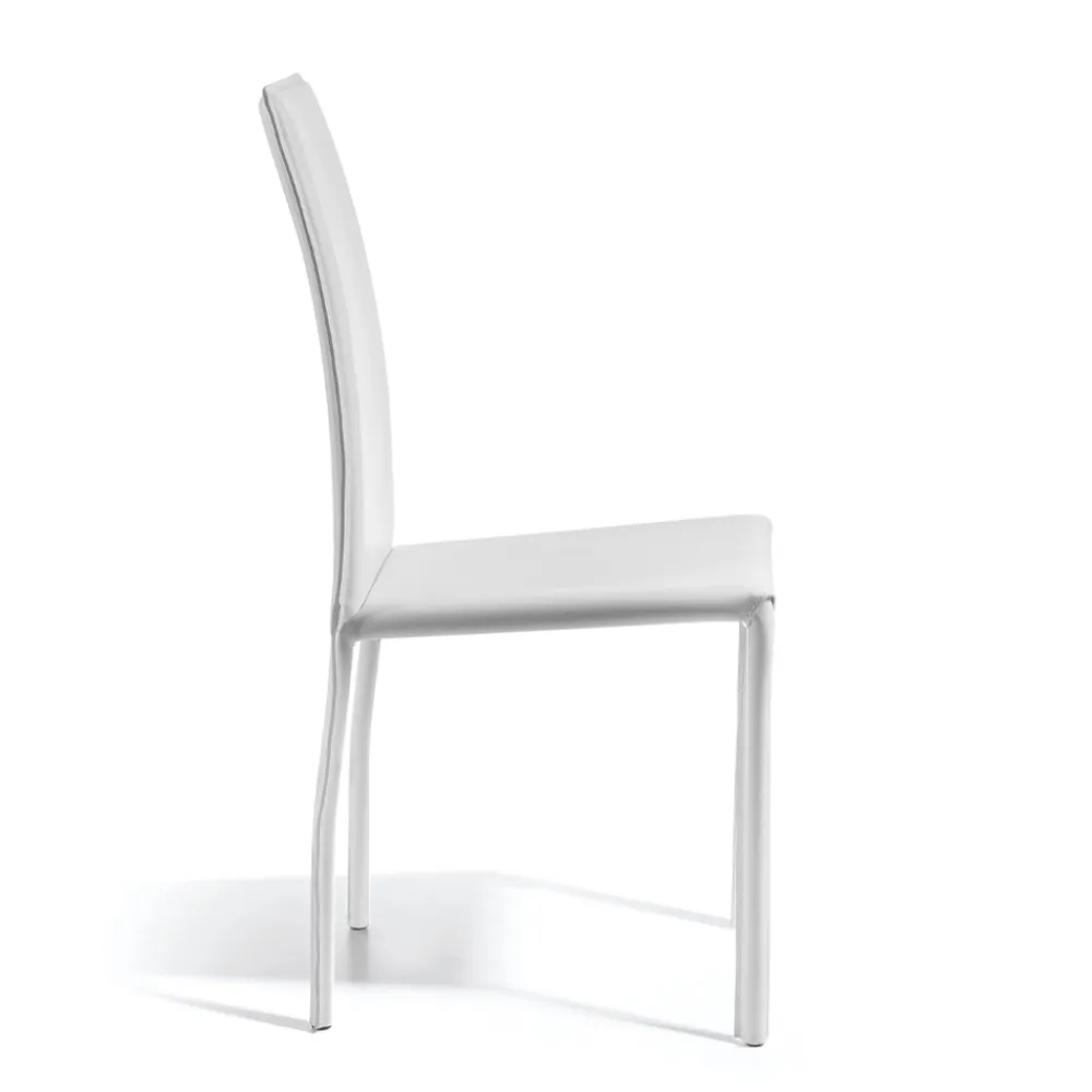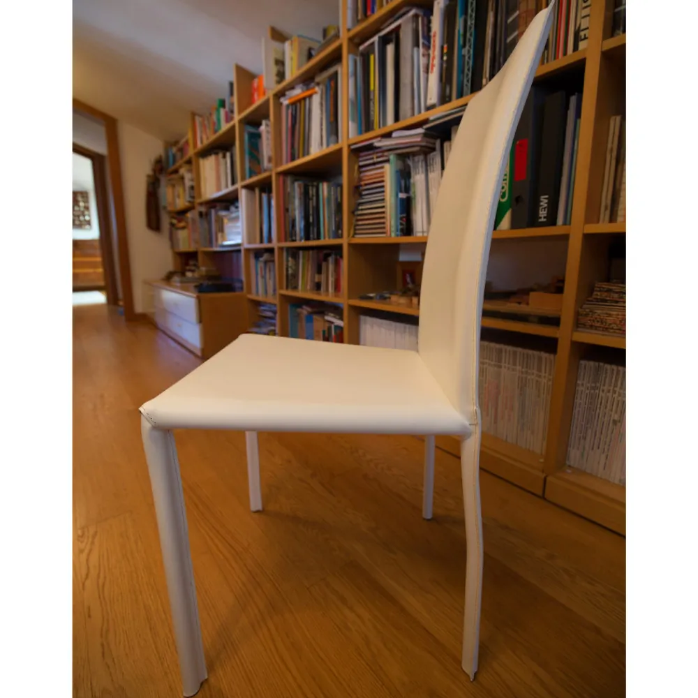Komplett in Italien hergestellter Esszimmerstuhl, komplett mit weißem Leder bezogen und Struktur mit rundem Bein von ø 22 mm.