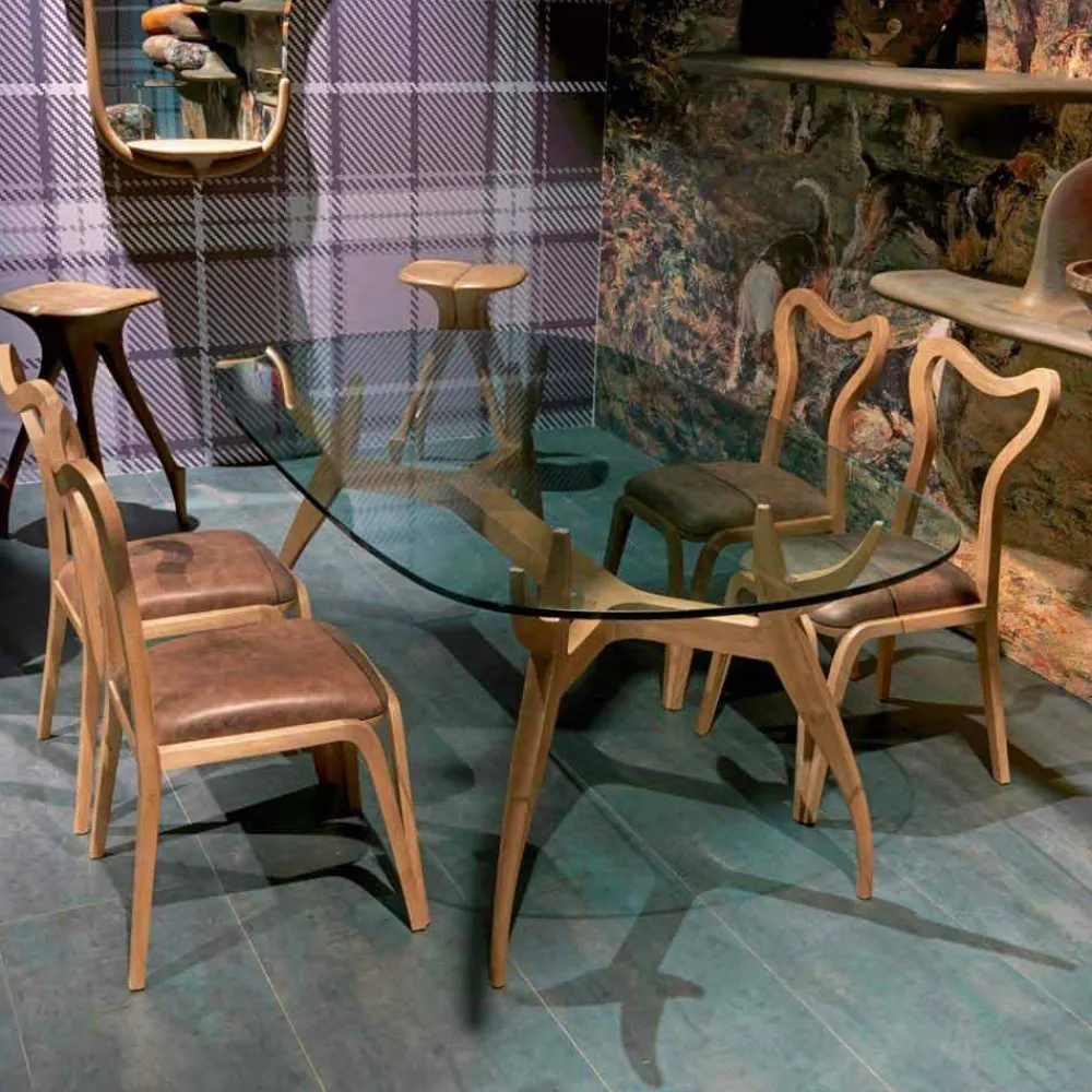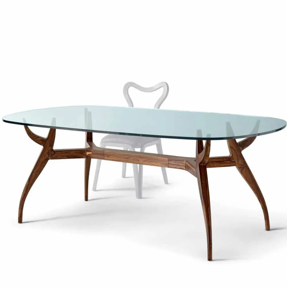 Die ovale Platte besteht aus Glas, während die Struktur aus Ziricote oder massivem Nussbaumholz besteht: Wählen Sie das gewünschte Finish aus dem Drop-Down-Menü.