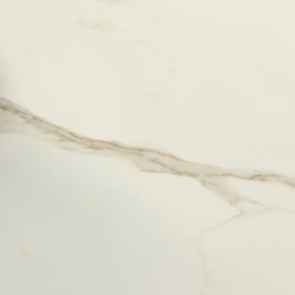 Wohnzimmertisch mit Metallbeinen in gebürsteter Messingoptik , 3 mm dicke Keramikplatte in Calacatta-Gold matt , vollständig in Italien hergestellt.