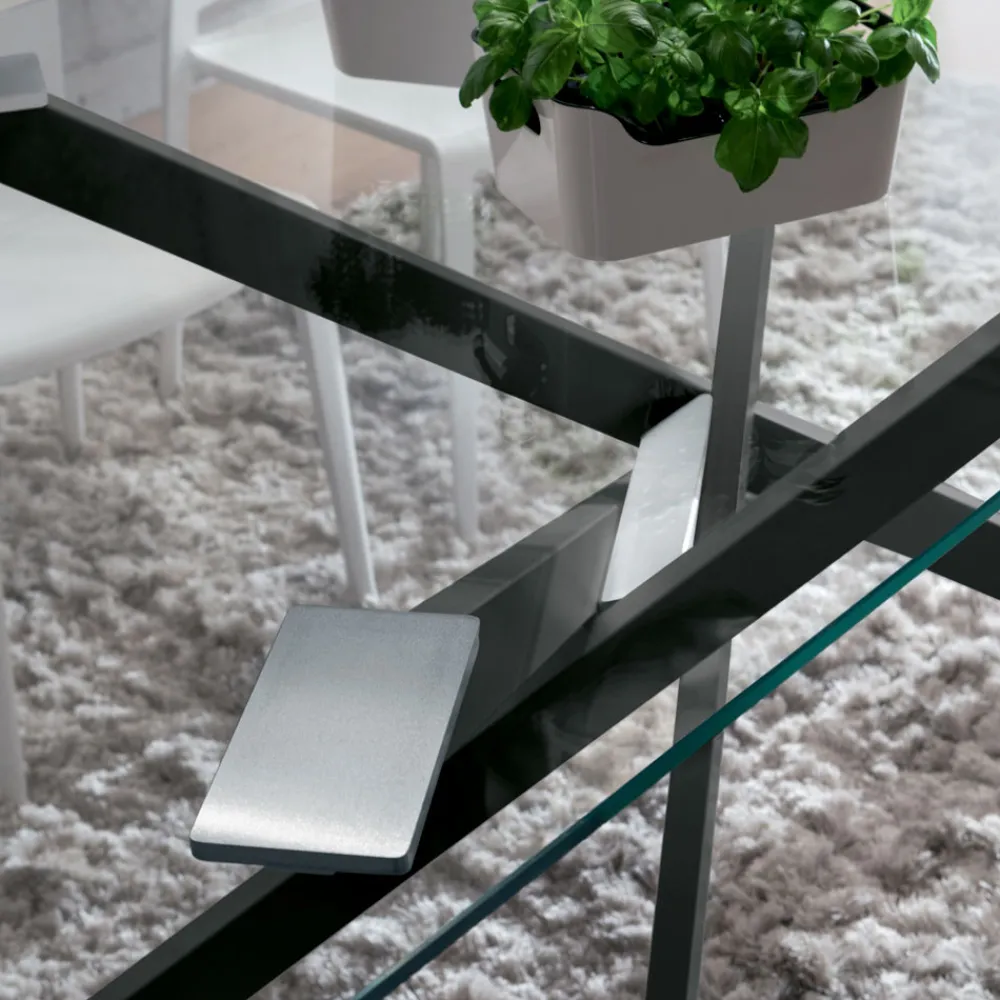 In Italien hergestellter Küchentisch mit extraklarer Hartglasplatte und epoxidpulverbeschichtetem Metallfuß . Ein einfacher und vielseitiger Stil , der sich dank seiner nüchternen und diskreten Linien an jede moderne Einrichtungssituation anzupassen weiß. Was sein Design einzigartig macht, ist die Besonderheit der ineinander verschlungenen Beine, die dem Tisch ein Gefühl von Harmonie verleihen und gleichzeitig seinen Wert und seine Persönlichkeit steigern. Dank der Verwendung von Glas, einem Material mit zeitloser Eleganz, stellt das Endergebnis die perfekte Kombination aus Modernität und raffiniertem Stil dar und erweist sich als besonders geeignete Lösung für Esszimmer oder Küchen mit zeitgenössischen Möbeln, in denen es jede Aufmerksamkeit erregen wird. zum wahren Protagonisten des Raums werden.