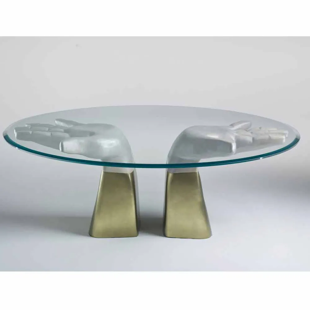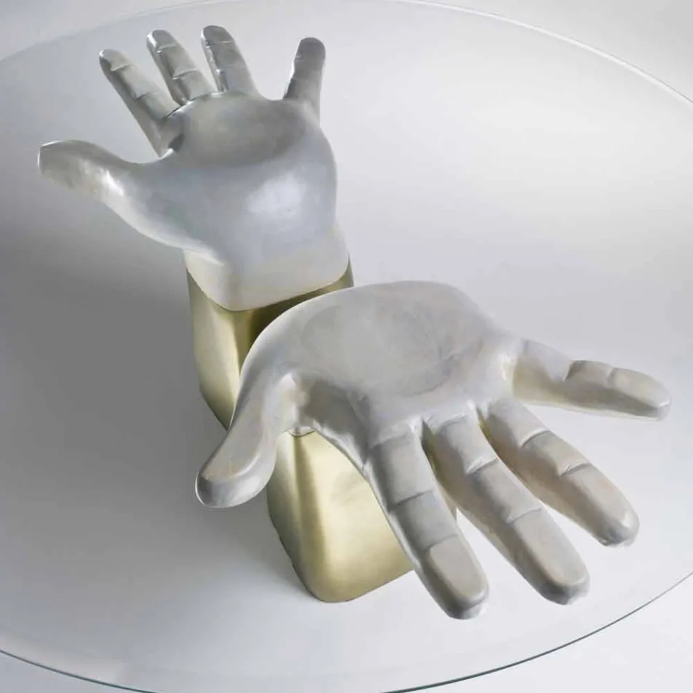 Struktur und Ornament verstärken sich gegenseitig: Das runde Oberteil wird von den Handflächen zweier Hände gestützt, riesigen handgeschnitzten Holzgliedern mit goldenen Manschetten, die an Pop-Vorschläge erinnern. Die Oberseite besteht aus abgeschrägtem Glas.