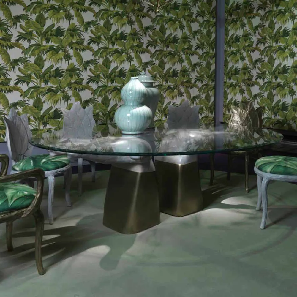 Geschnitzter Esstisch mit Sockel aus 2 geschnitzten Holzhänden, 15 mm geschliffene Glasplatte. Erhältlich in zwei verschiedenen Ausführungen: Wählen Sie den gewünschten aus dem Dropdown-Menü.