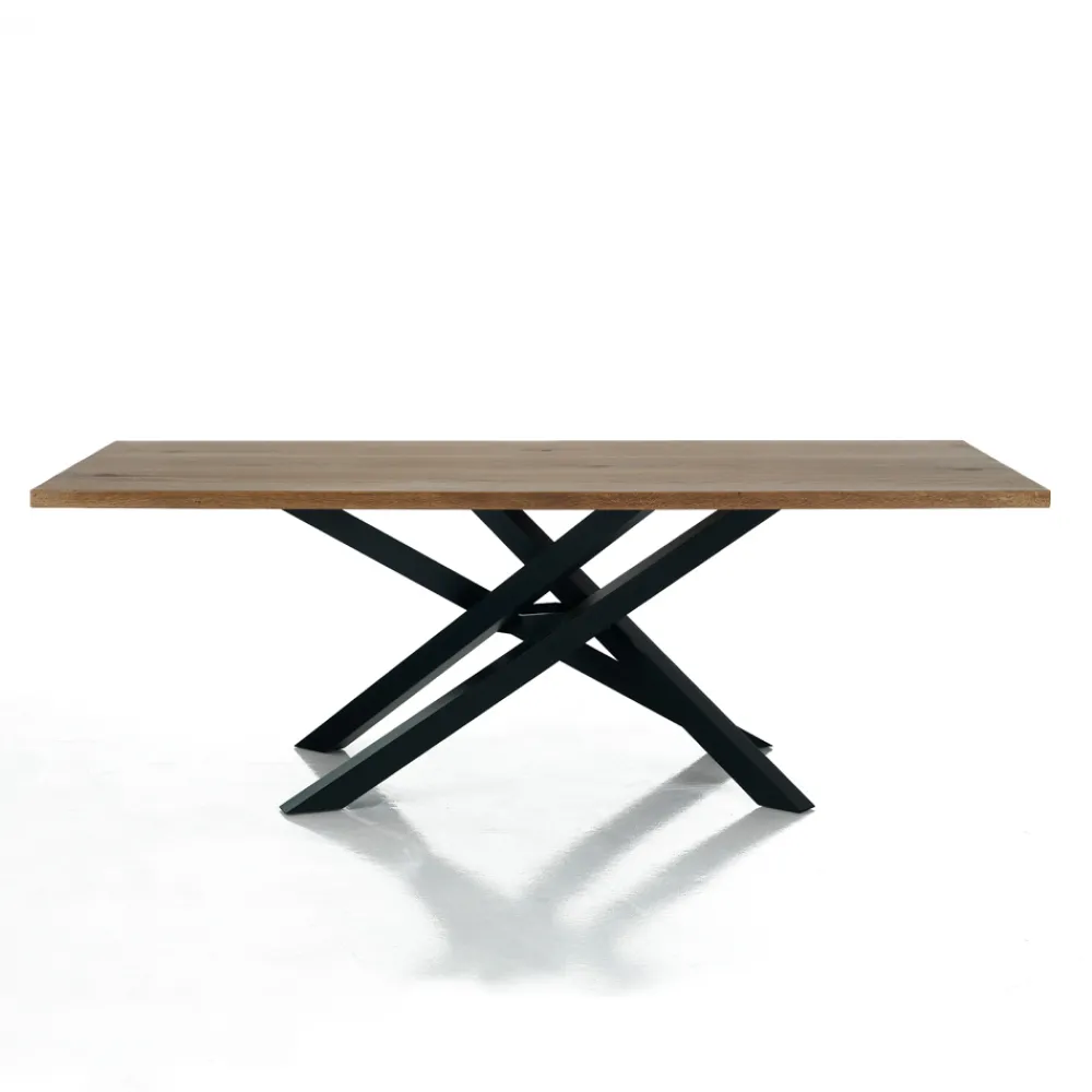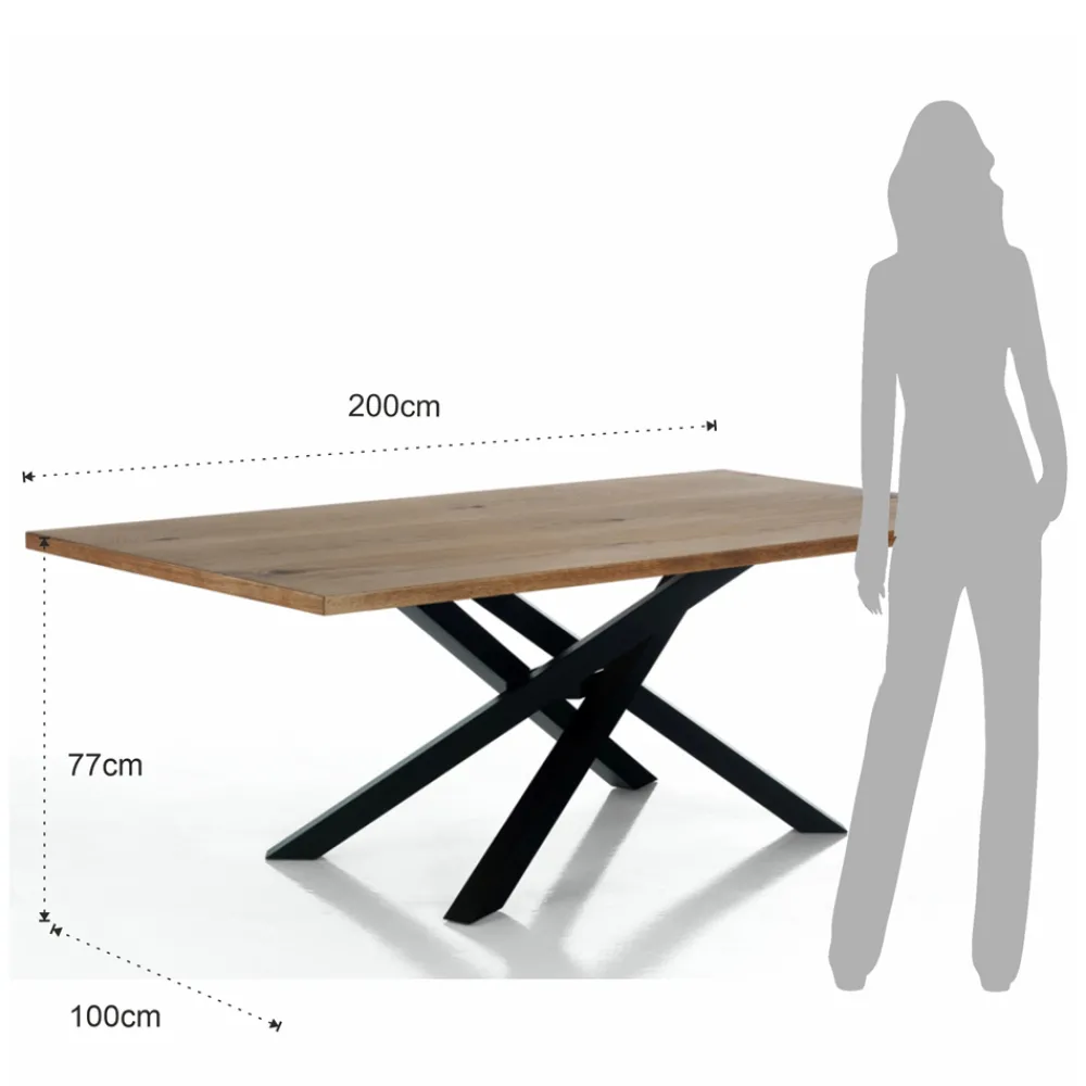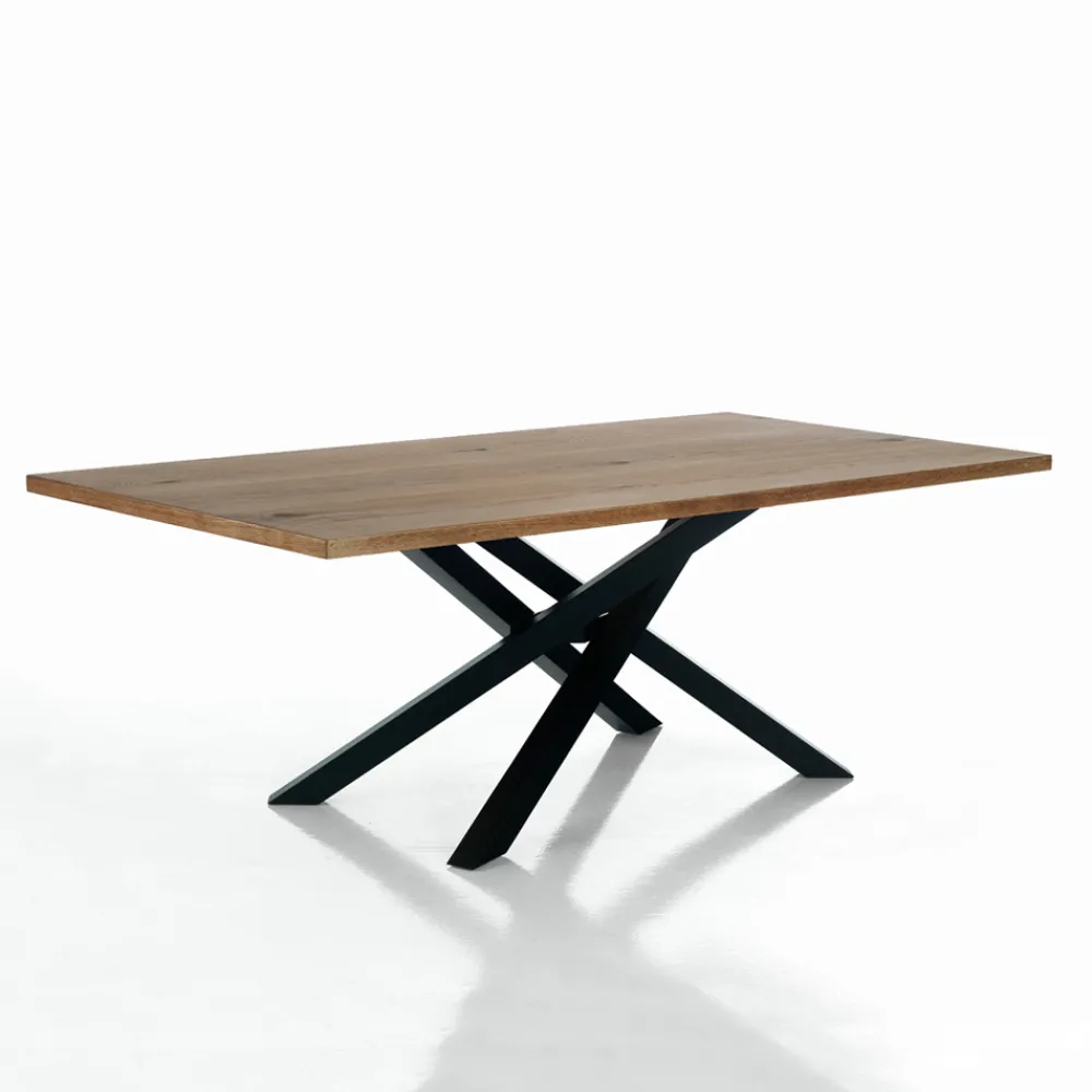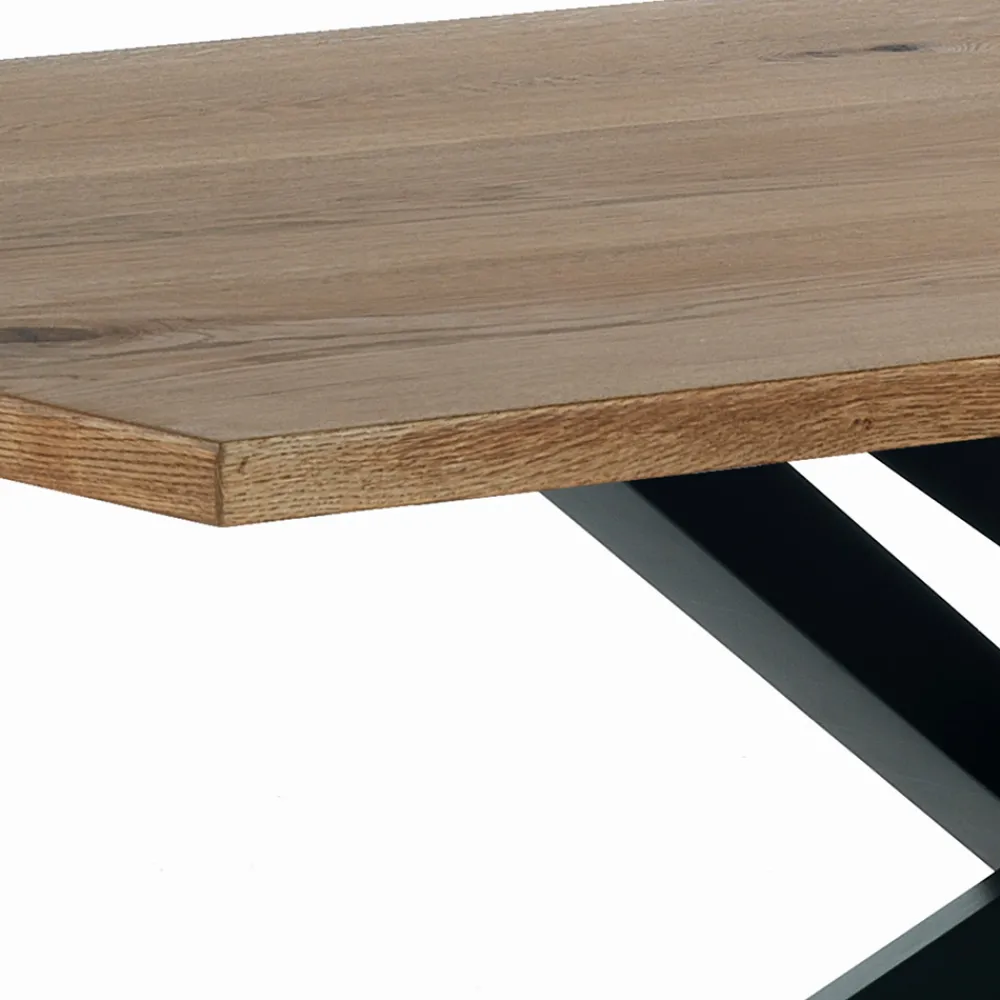Tisch für den Innenbereich mit Platte aus massivem Birkenholz, 36 mm dick. Eiche furniert , Sockel aus massivem Birkenholz, mattschwarz lackiert, Stärke 7×7 cm, komplett .