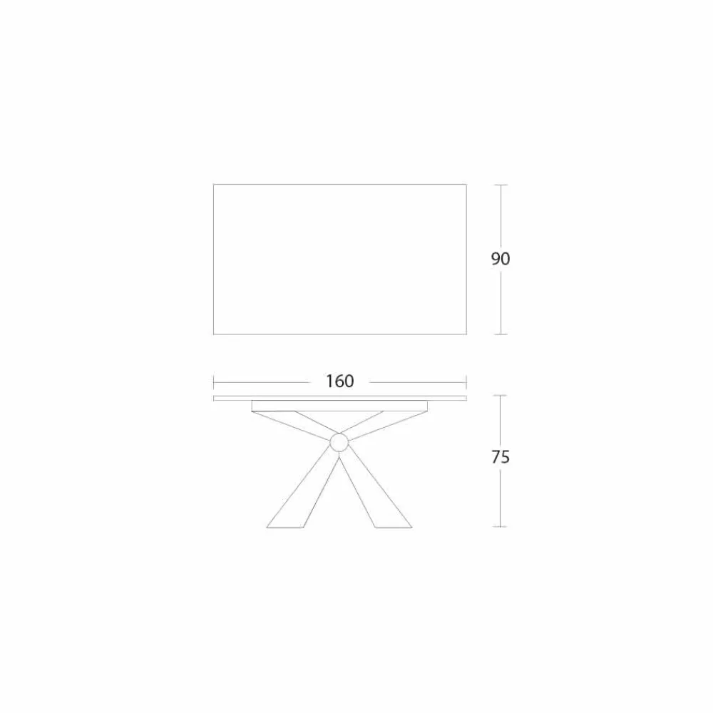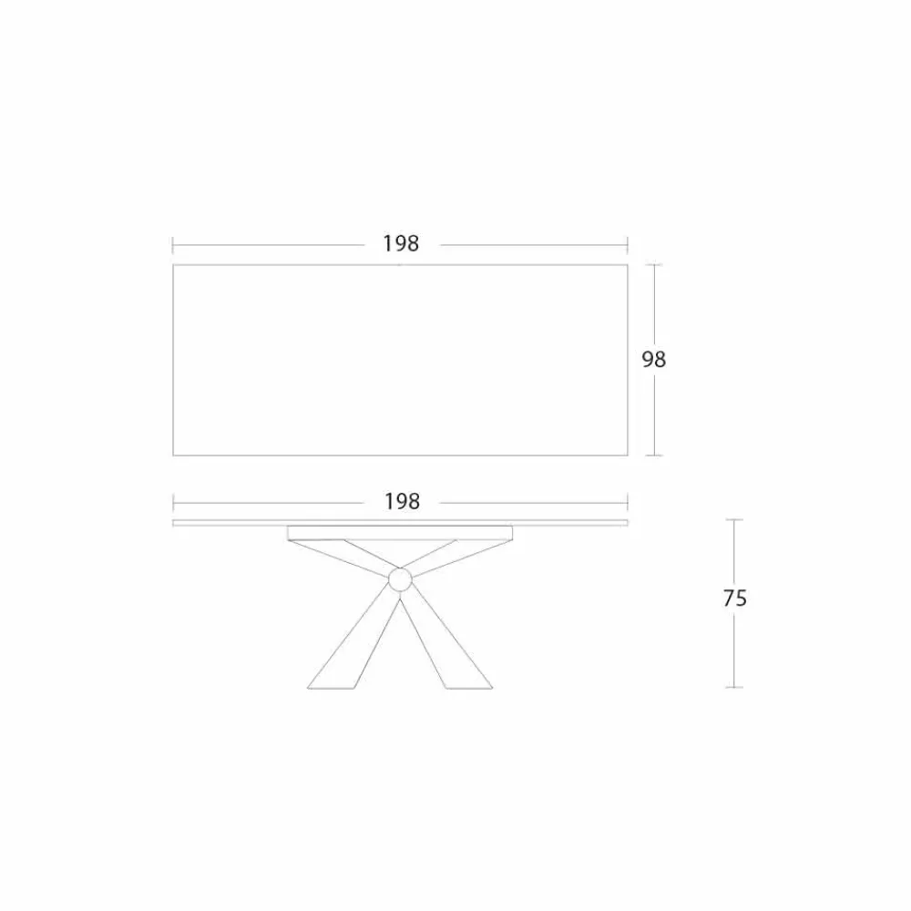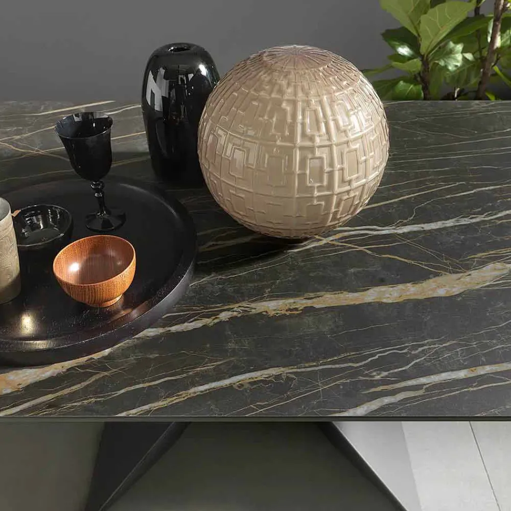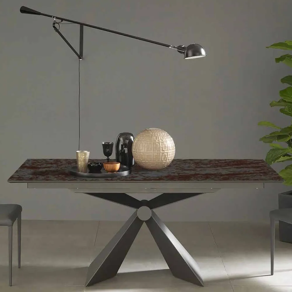 Dieser rechteckige Esstisch hat eine Platte aus MDF-Platte mit Laminam-Keramik auf der Oberfläche, die in verschiedenen Ausführungen erhältlich ist, und einen Sockel aus geprägtem, graphitfarbenem Metall mit 4 Beinen, die in der Mitte in einem Metallstützknoten zusammenlaufen, der zur Besonderheit des Designs wird des Komplements und garantiert seine hohe Stabilität.