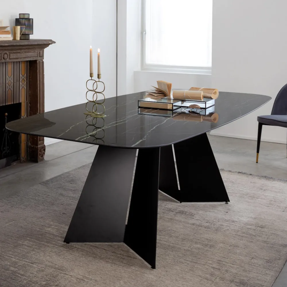 Lassen Sie sich vom kühnen Stil und der innovativen Form dieses Esstisches verführen. Die Keramikplatte reflektiert das Licht und verleiht dem umgebenden Raum eine elegante Dimension, während der schwarze Stahlsockel ein geometrisches Design zum Ausdruck bringt, das ebenso funktional wie künstlerisch ist.
