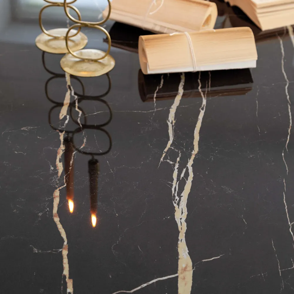 Esstisch mit glänzender Florim-Keramikplatte (6 mm Keramik + 18 mm Melamin) und Untergestell aus schwarz lackiertem Stahl.