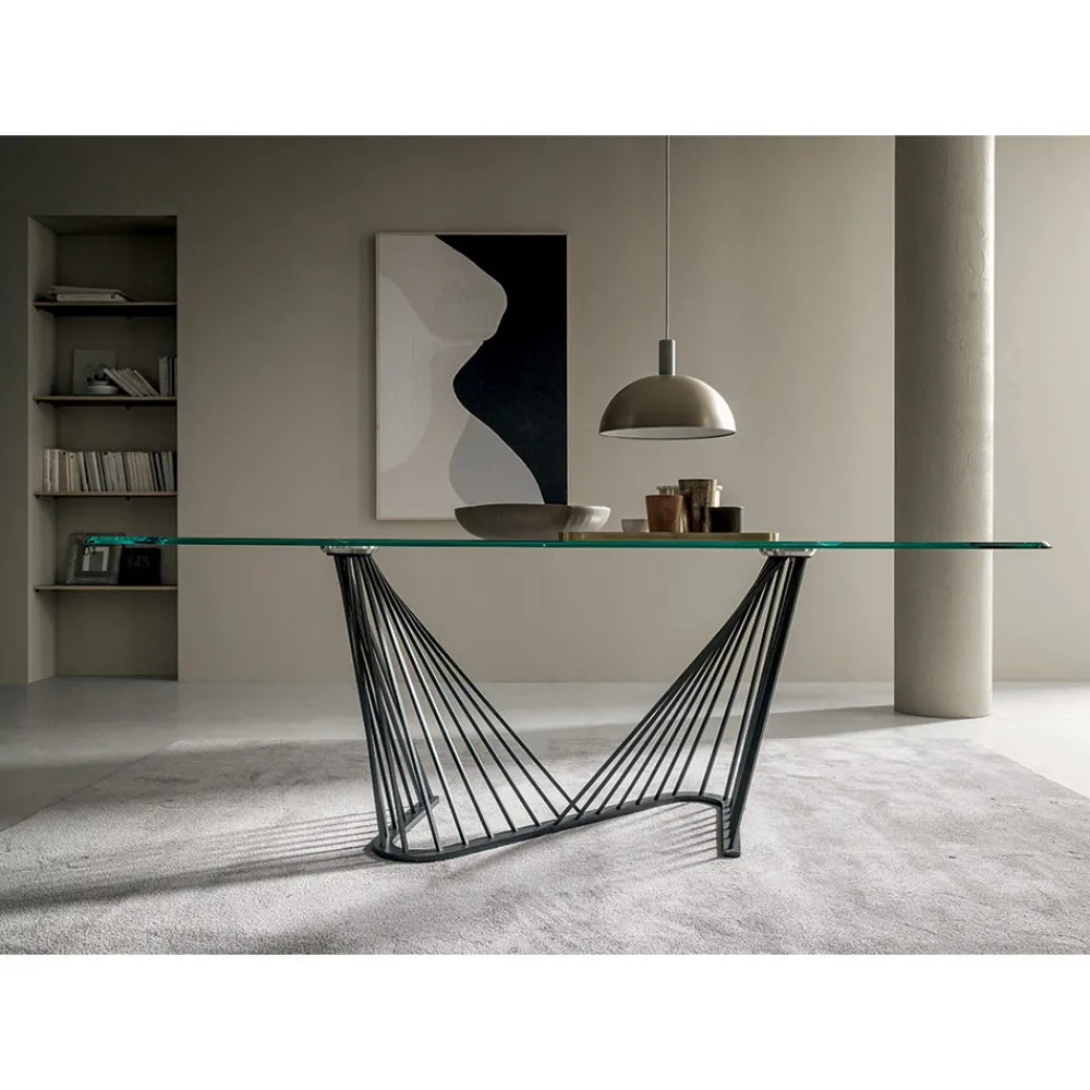 Esstisch aus transparentem Glas und Basis mit Metallseilen, 2 Größen made in Italy.