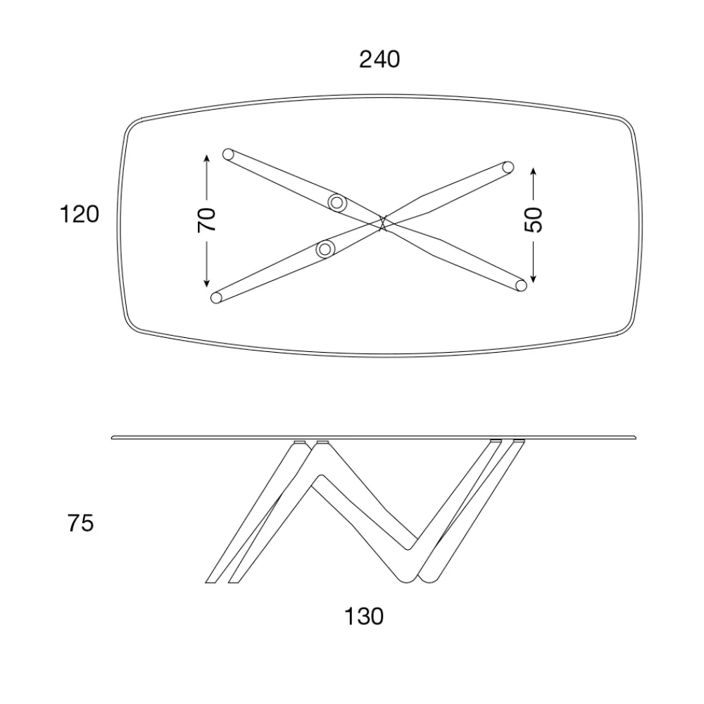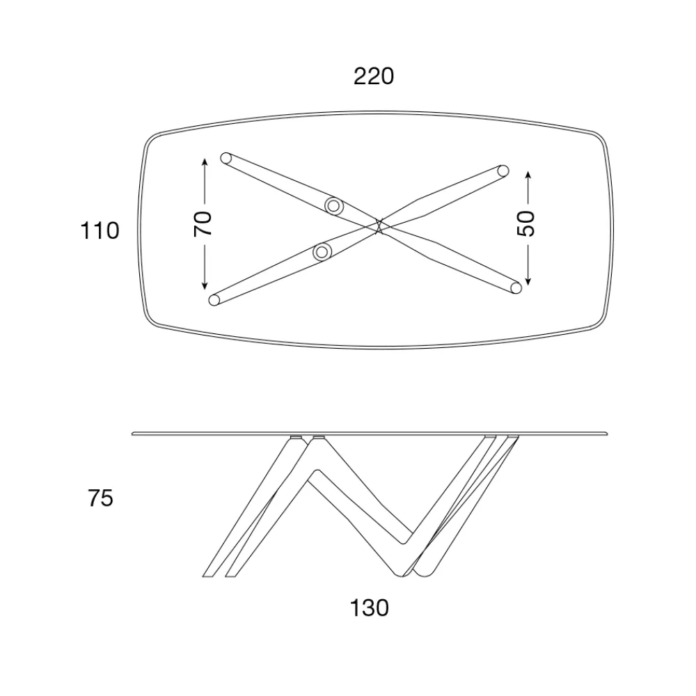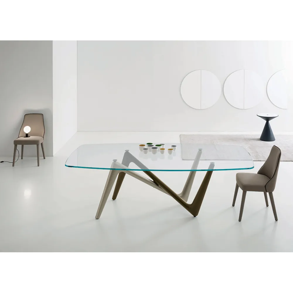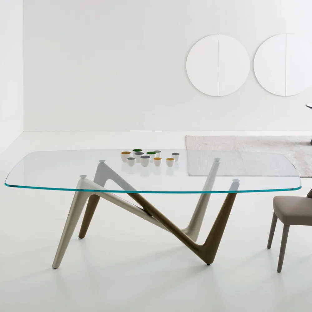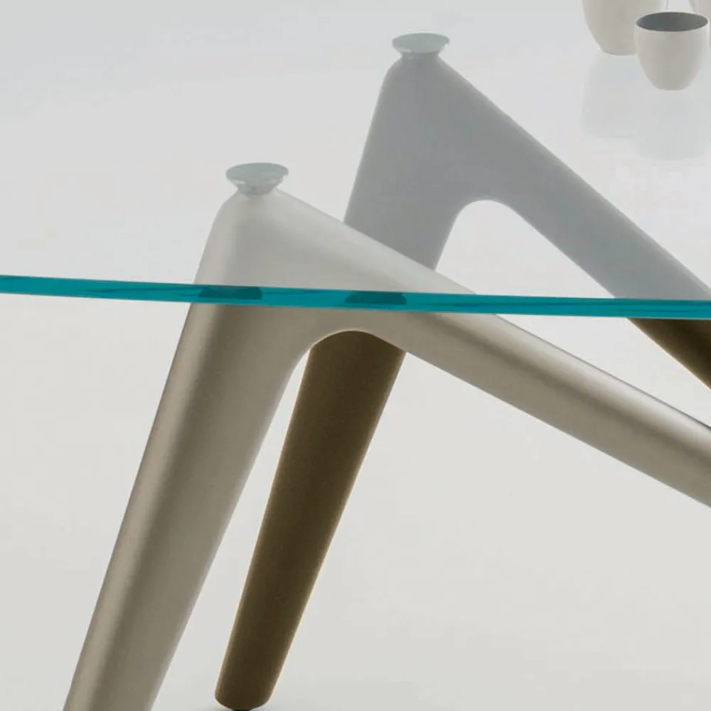 Seine Besonderheit wird durch sein dynamisches und innovatives Image sowohl in Bezug auf Ästhetik als auch Funktionalität gegeben: Die Struktur verschlingt sich , um die Platte leicht zu stützen und ihr ein skulpturales und raffiniertes Aussehen zu verleihen.