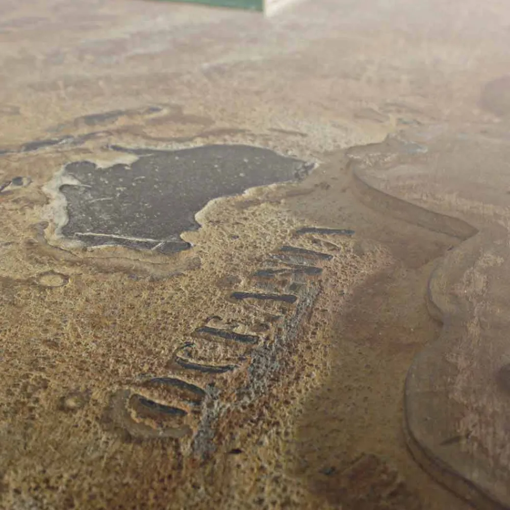 Struktur in antiqued Stahl, Glas und MDF – Platte mit Beton Dekoration.