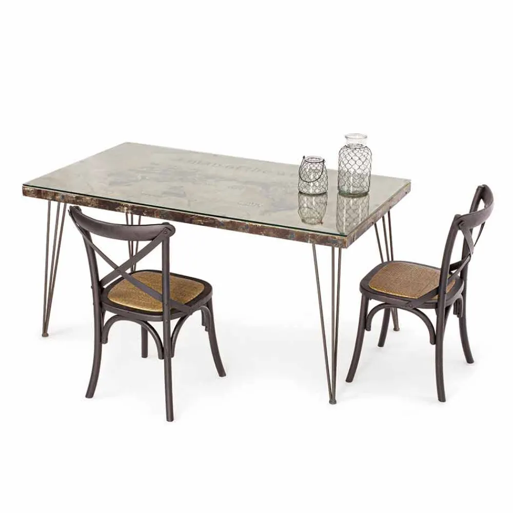 Esstisch im Industriestil mit MDF- und Glasplatte und Stahlfuß.