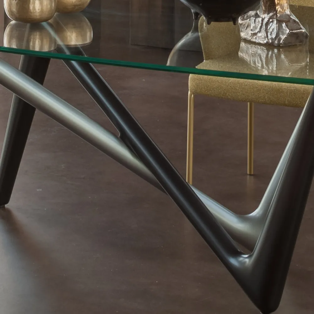 Der Tisch in fester Ausführung ist eine vielseitige Lösung für verschiedene Einrichtungsstile. Die Glasplatte in Kombination mit dem lackierten Sockel trägt dazu bei, den Charakter des Hauses zu definieren. Erhältlich in zwei verschiedenen Plattengrößen, um den Platzbedarf besser zu erfüllen. Die Tischstruktur umfasst Beine aus lackiertem Hartpolyurethan, und die tonnenförmige Platte besteht aus extraklarem, transparentem Hartglas mit abgeschrägter Kante und bietet die Wahl zwischen einem modernen und eleganten Look oder einem traditionelleren und robusteren Look.