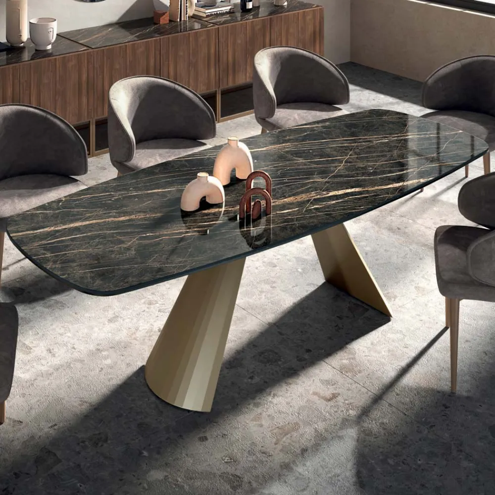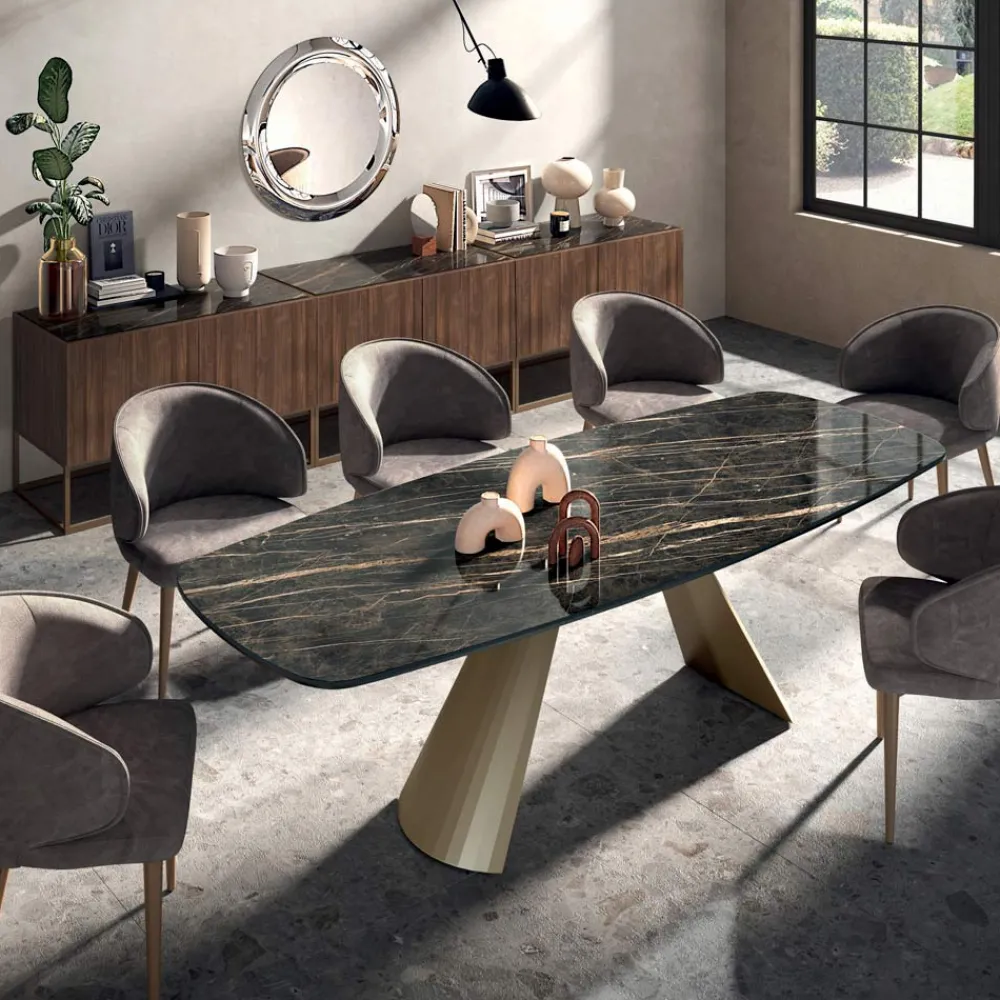 Die Auswahl hochwertiger Materialien und die Liebe zur Gestaltung jedes einzelnen Details schaffen ein Produkt von ausgezeichneter Qualität „Made in Italy“ . Dank der Form des Gestells und der verfügbaren Ausführungen ist dieser Tisch der Protagonist jeder alltäglichen Objektumgebung und eine perfekte Idee für alle, die dem Raum eine elegante, prächtige und einzigartige Note verleihen möchten.