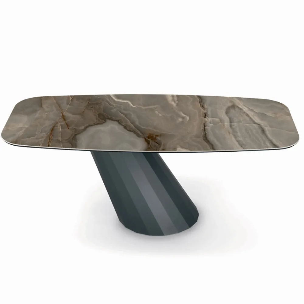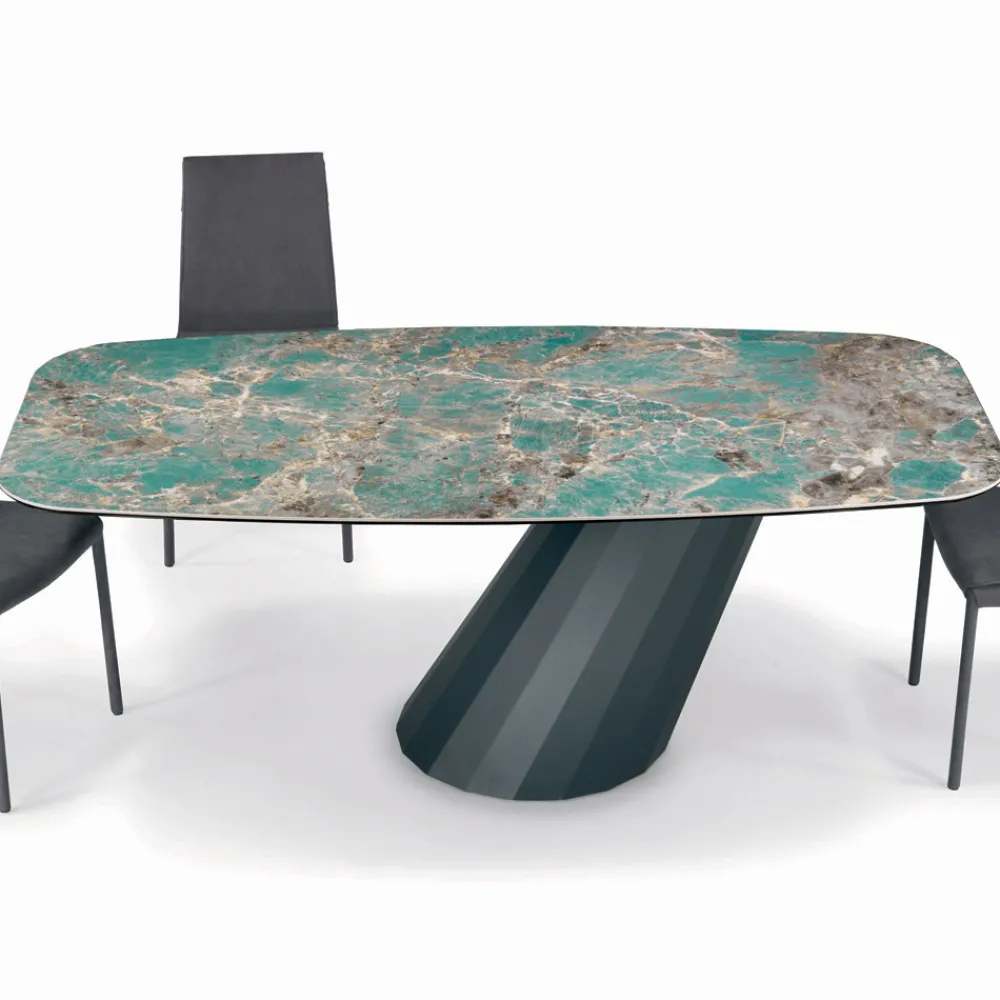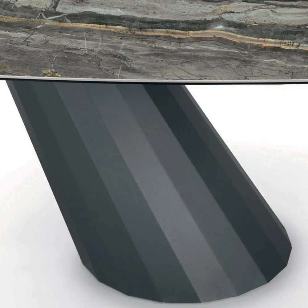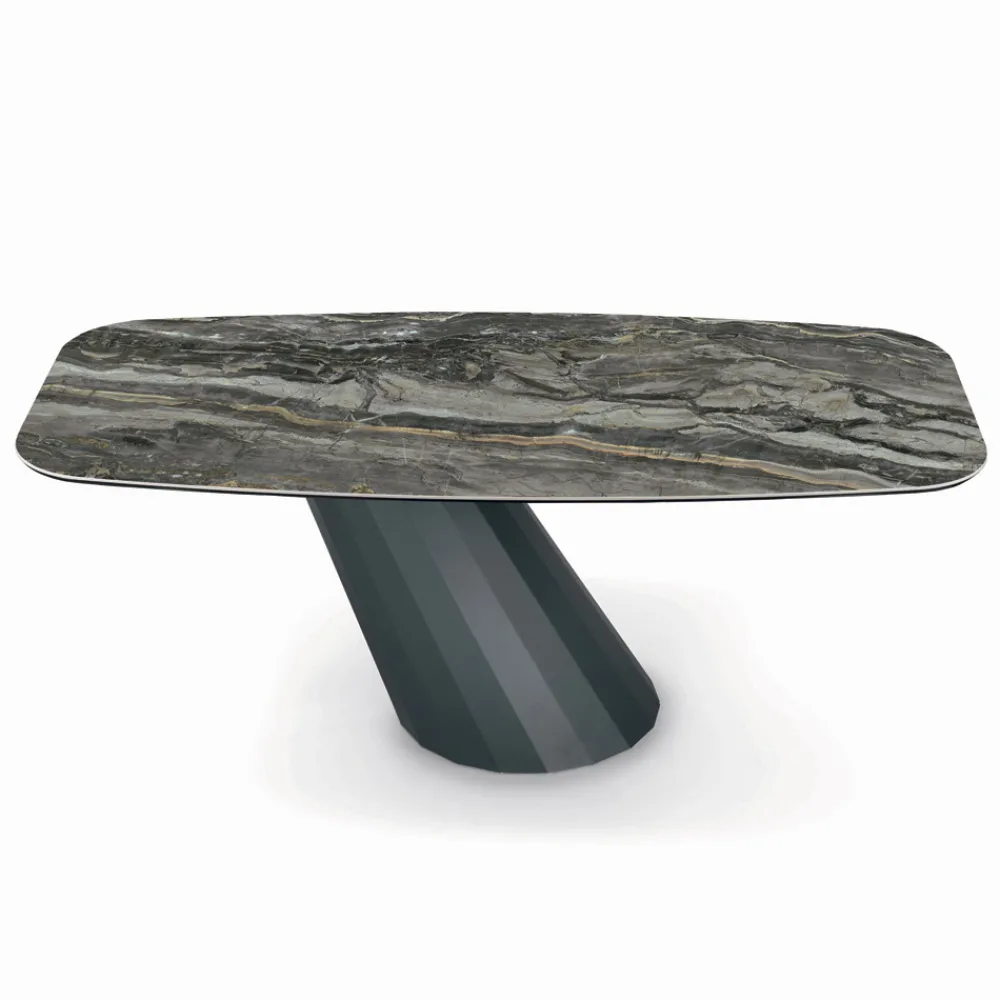 Fester, tonnenförmiger Wohnzimmertisch mit Keramikplatte , 45° abgeschrägter Kante , Untergestell aus graphitlackiertem Stahl und verstellbaren Füßen, hergestellt in Italien.