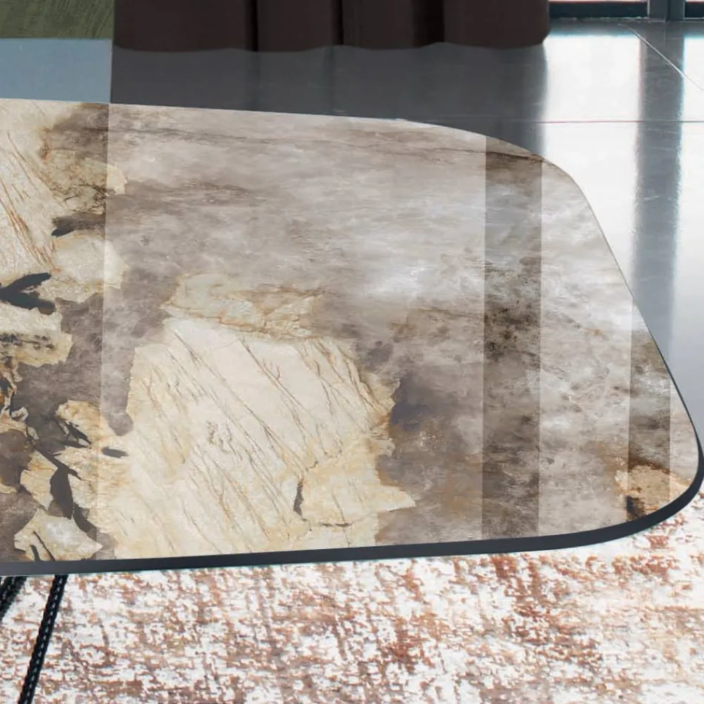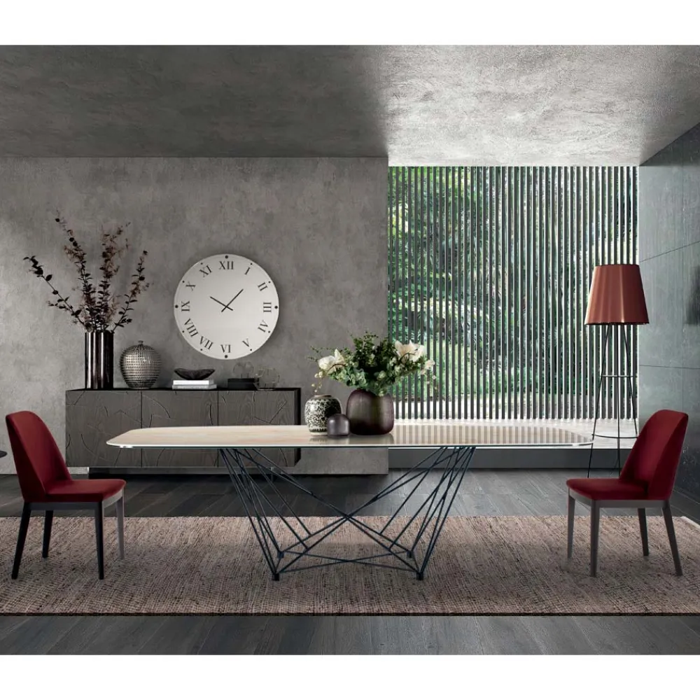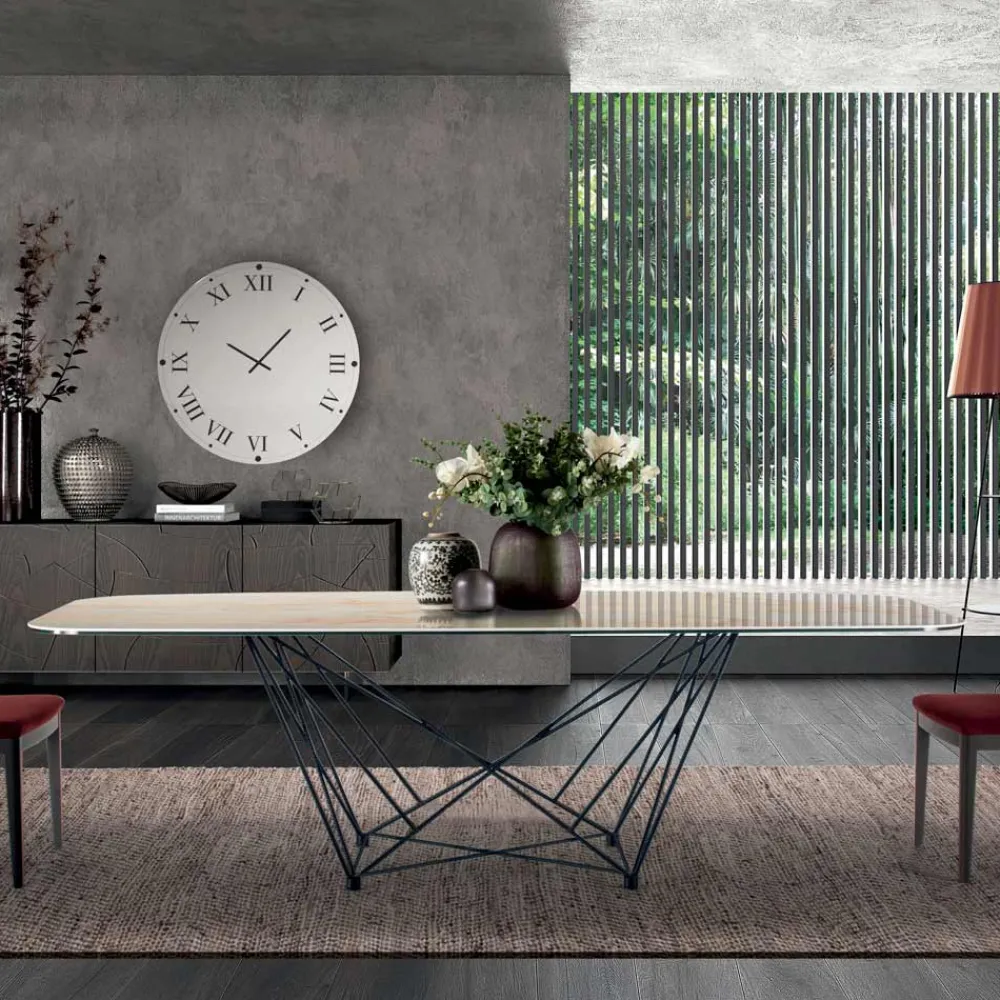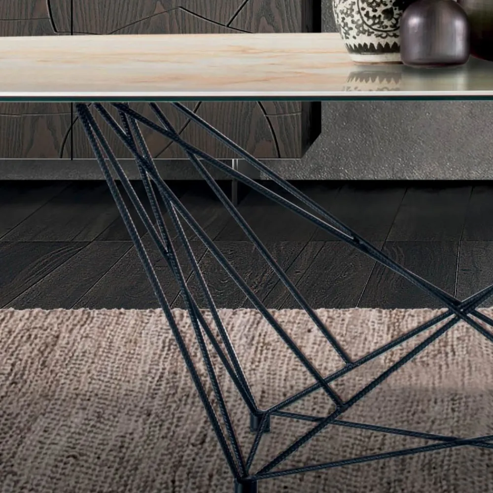 Das charakteristische Element dieses Produkts ist das visuelle Spiel von Linien und Formen, das durch das Stahlgestell entsteht und dem Tisch Bewegung und Originalität verleiht. Diese Möbel sind perfekt für alle, die ihre Wohn- oder Objektumgebung mit einer raffinierten und raffinierten Note einrichten möchten, ohne auf Funktionalität zu verzichten. Die italienischen Kunsthandwerker wollten einen Tisch schaffen, der nicht nur schön anzusehen, sondern auch zu verschiedenen Anlässen verwendbar ist.