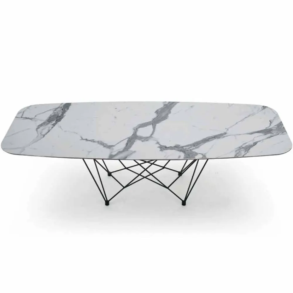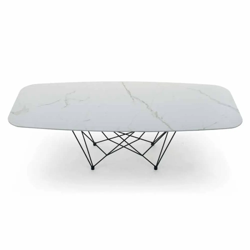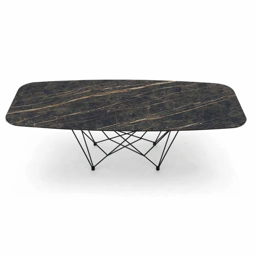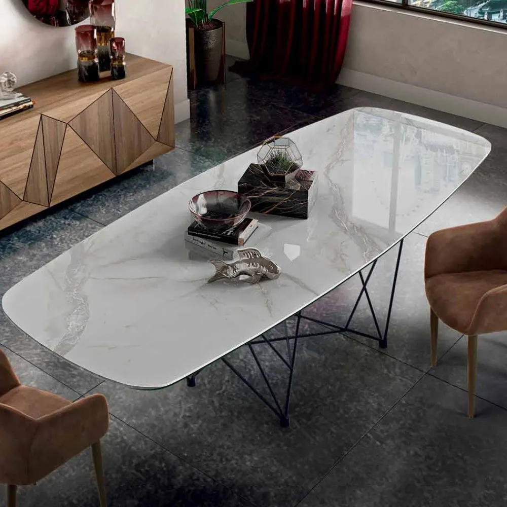 Moderner und raffinierter Esstisch, handgefertigt in Italien mit tonnenförmiger Oberseite aus Laminam-Keramik, hergestellt aus einer abgeschrägten Glasplatte und einer aus Keramik, und Sockel aus schwarz lackiertem Stahl . Aus der perfekten Kombination von Funktionalität und Design entsteht ein Einrichtungsaccessoire mit einer raffinierten Seele, das Esszimmer oder Küchen auf exklusive Weise mit einem modernen Stil vervollständigt und ihm einen revolutionären Touch verleiht. Die Ästhetik des Tisches wird auch durch die besondere Form des Untergestells bereichert, die dem Erscheinungsbild des Produkts ein originelles Detail verleiht und einer exklusiven Einrichtungslösung mit einer starken zeitgenössischen Persönlichkeit Leben einhaucht. Die funktionale Seite wird jedoch durch die wunderschöne Laminam-Keramikplatte noch verstärkt Dies macht den Tisch nicht nur einzigartig, sondern bietet auch eine unvergleichliche Qualität und ist daher ideal, um eine solide und gleichzeitig einzigartige und edle Tischplatte zu garantieren.