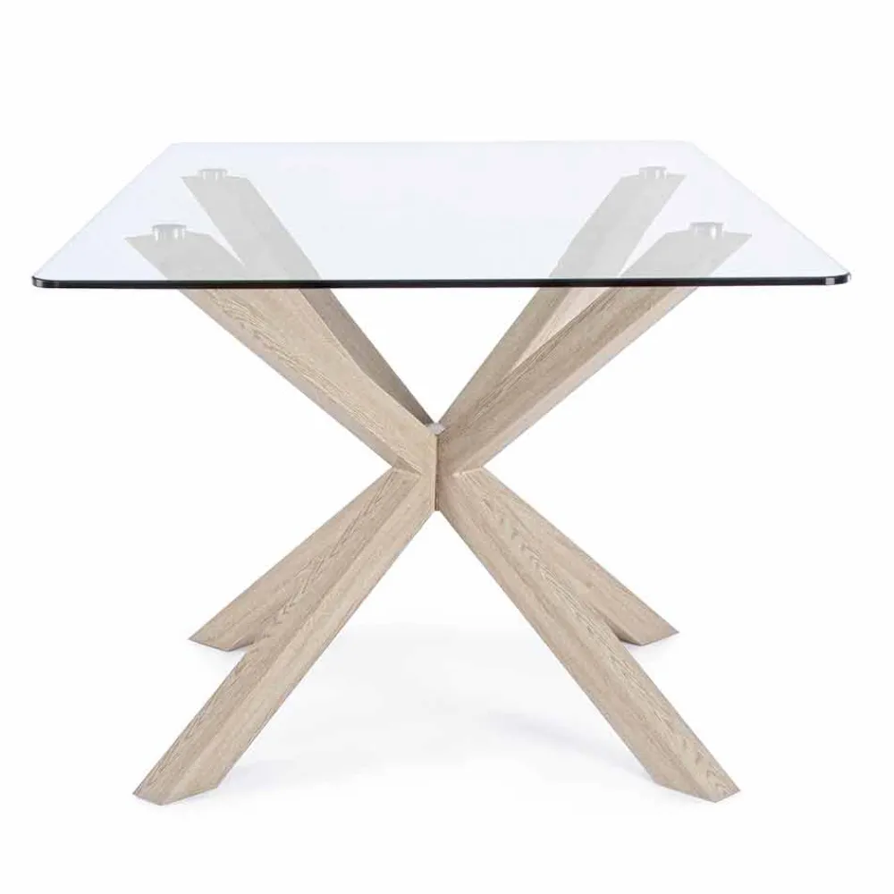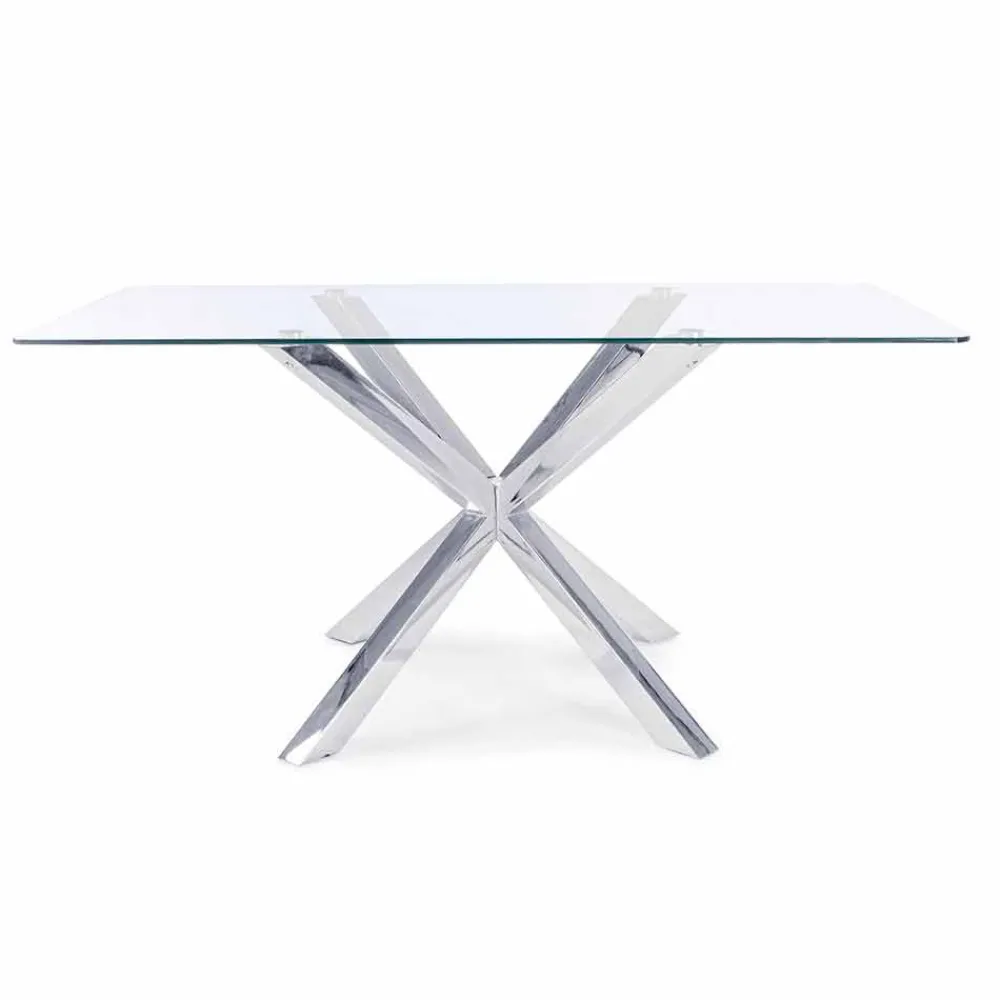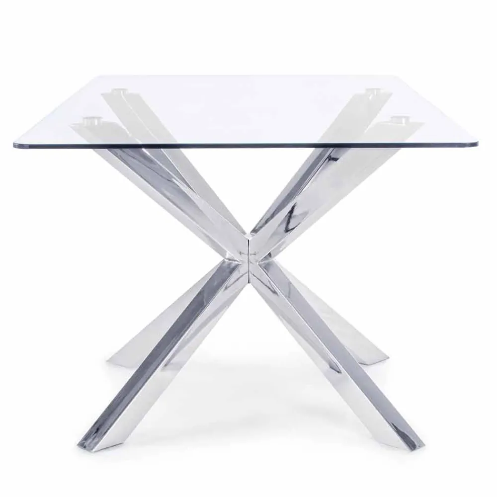 Moderner Esstisch mit gehärteter Glasplatte und Stahlbeinen.