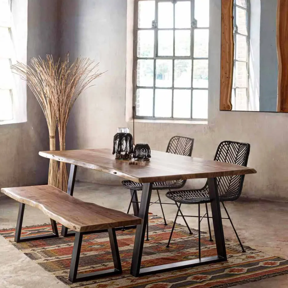 Moderner Esstisch mit Akazienholzplatte.