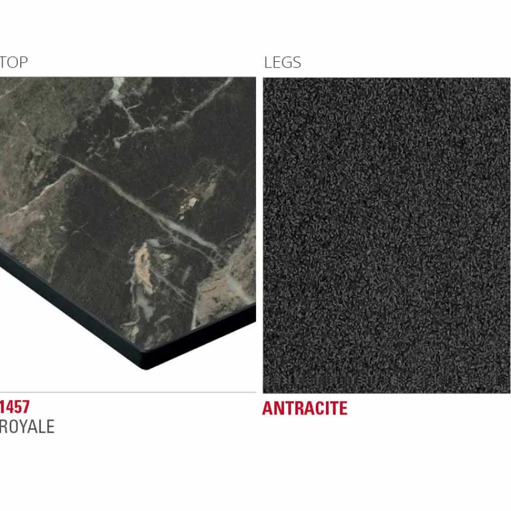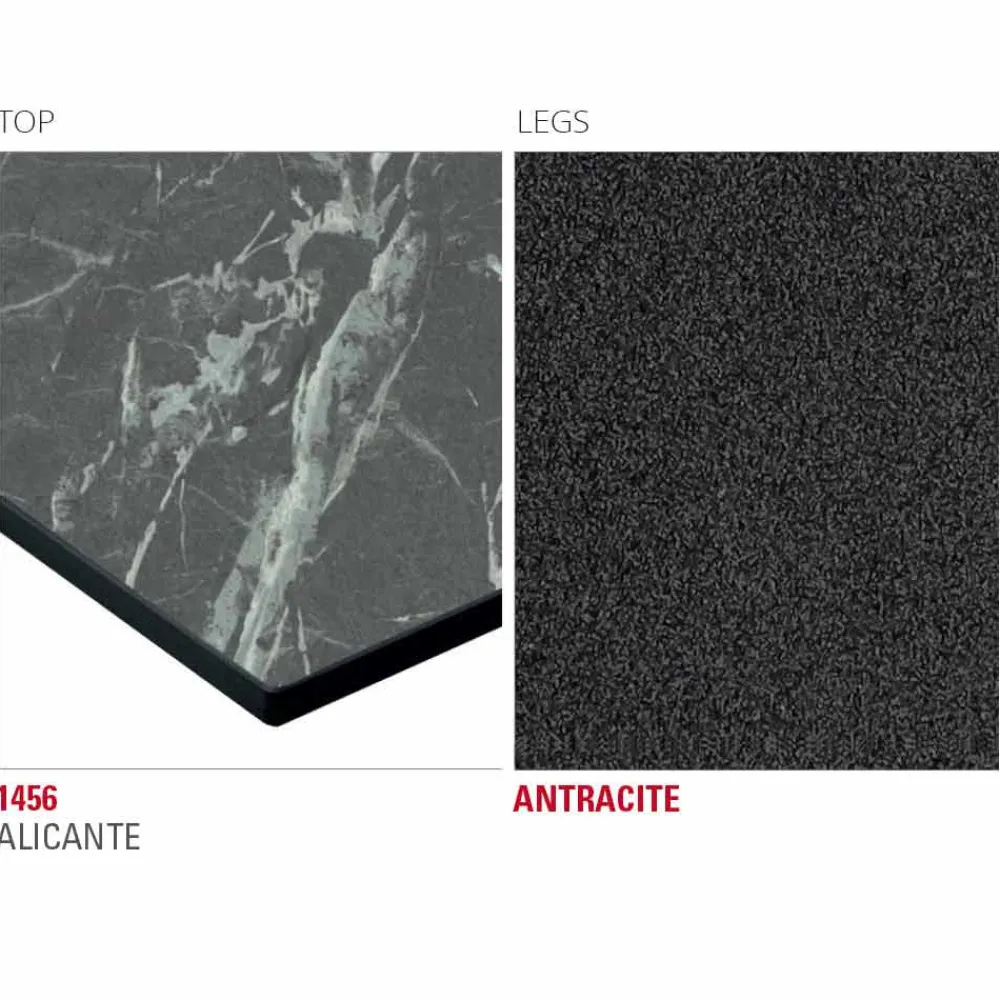 Küchentisch mit geschichteter HPL-Platte (Dicke 10 mm), die in Tonnenform geschichtet ist und auf einer MDF-Platte und mit Epoxidpulvern in Anthrazit lackierten Metallbeinen getragen wird. Dieses in Italien aus hochwertigen Rohstoffen hergestellte Möbelstück bietet eine hervorragende Beständigkeit gegen Chemikalien, Abrieb und Kratzer und gewährleistet gleichzeitig eine solide und robuste Oberfläche , die ihre ästhetischen Eigenschaften im Laufe der Zeit unverändert behält. Darüber hinaus ermöglicht die große Auswahl an vorgeschlagenen Oberflächen, die von Holzoptik über Stein bis hin zu einer Marmorstruktur reichen, unterschiedliche Lösungen zu bieten, die den Geschmack und die Bedürfnisse auf exklusive und raffinierte Weise erfüllen können. Der Metallfuß hingegen verleiht ein originelles und kreatives Element und vervollständigt das Aussehen des Tisches mit einem Hauch von Modernität.