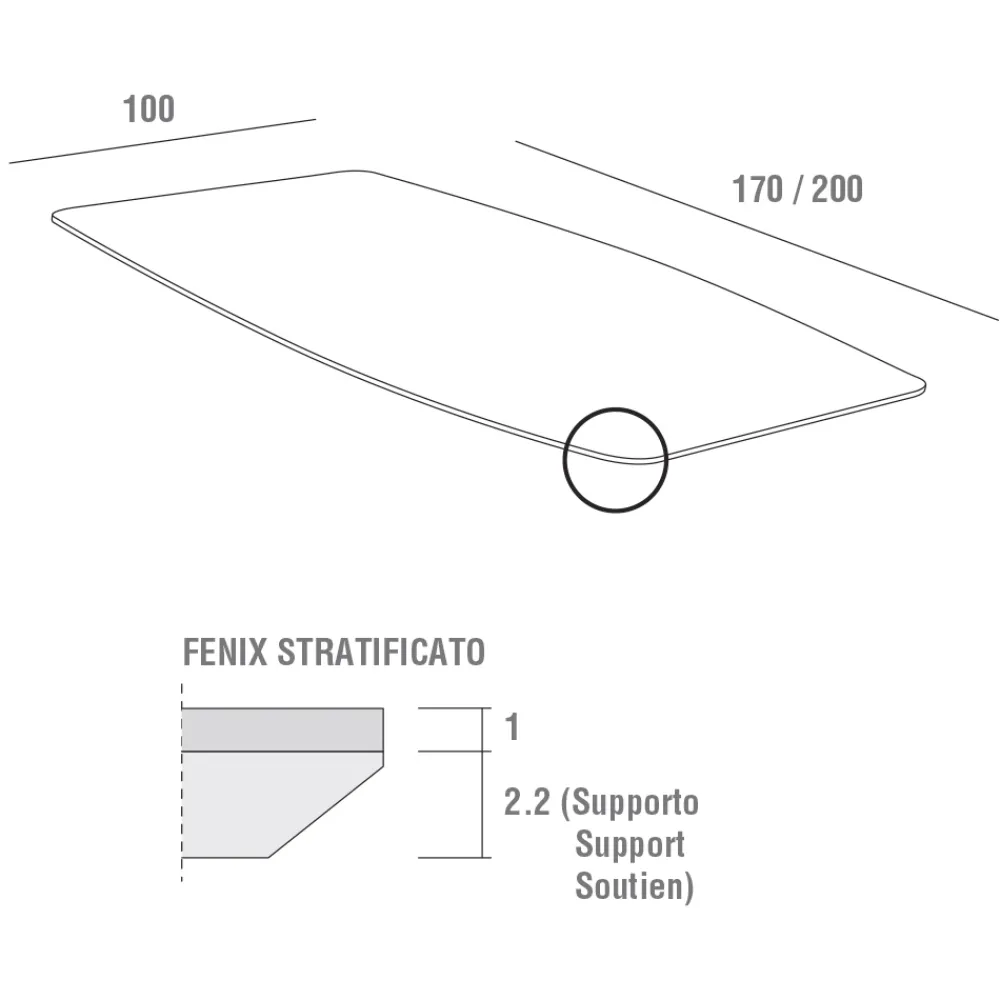 Seine Besonderheit ist die geschichtete Fenix-Platte, ein Material, das durch die Verwendung innovativer Harze entsteht und eine widerstandsfähige, angenehm anzufassende und extrem undurchsichtige Oberfläche bietet , Eigenschaften, die nicht nur die funktionale Seite des Tisches erhöhen, sondern auch seine Raffinesse unterstreichen und vervollständigen Ästhetik, die eine exklusive und elegante Note verleiht.