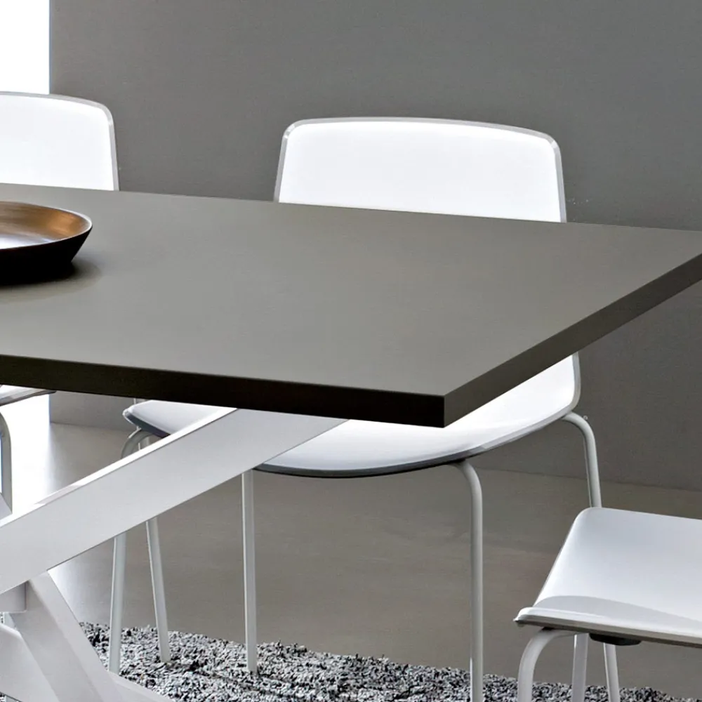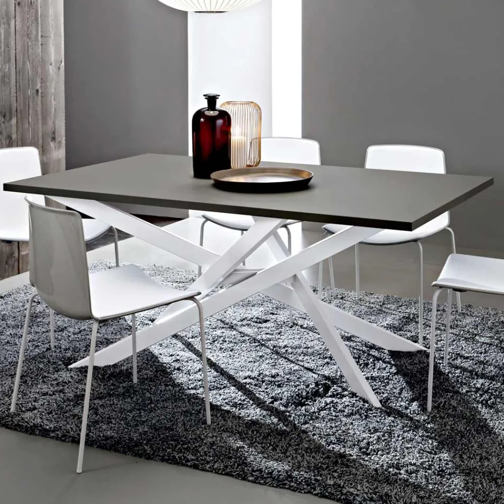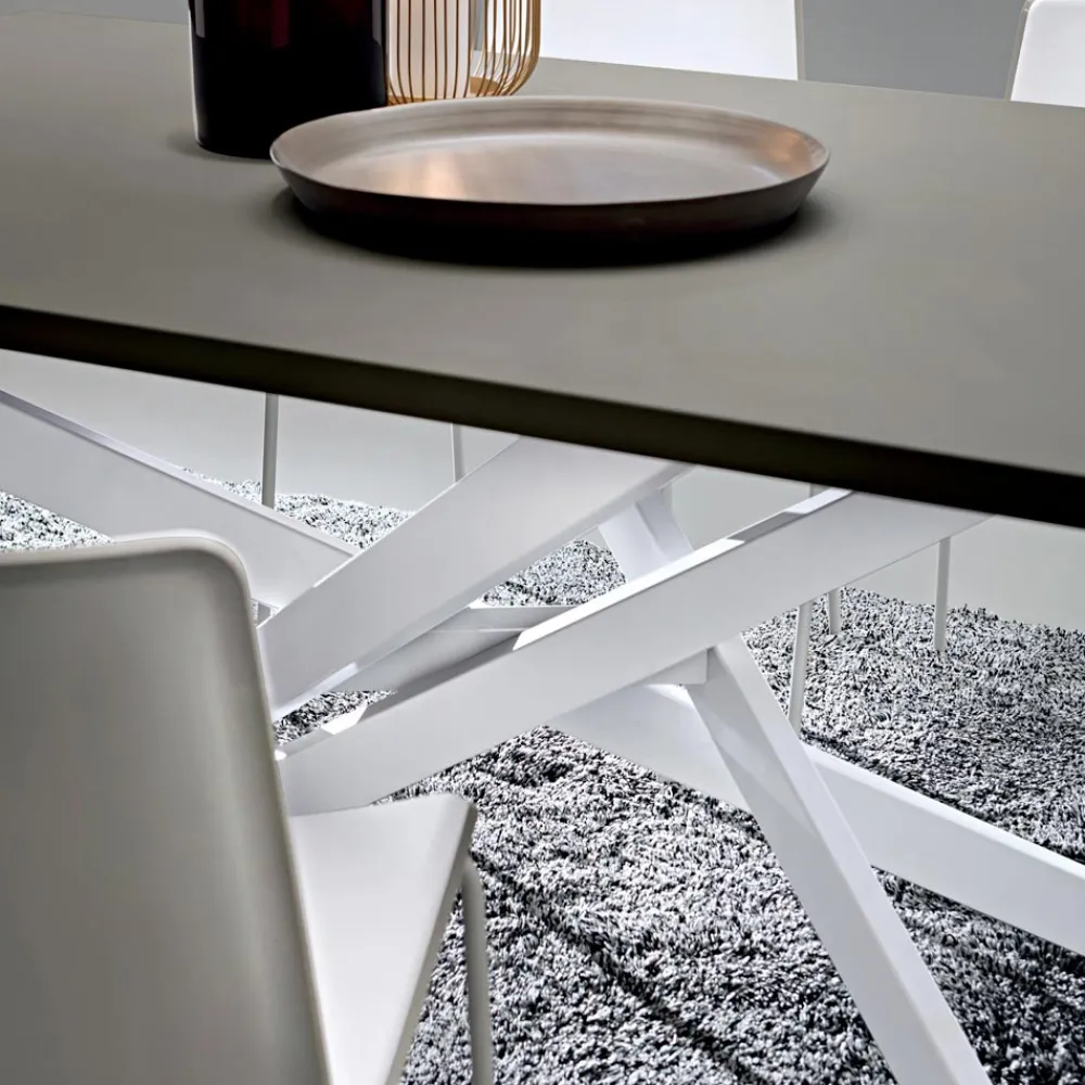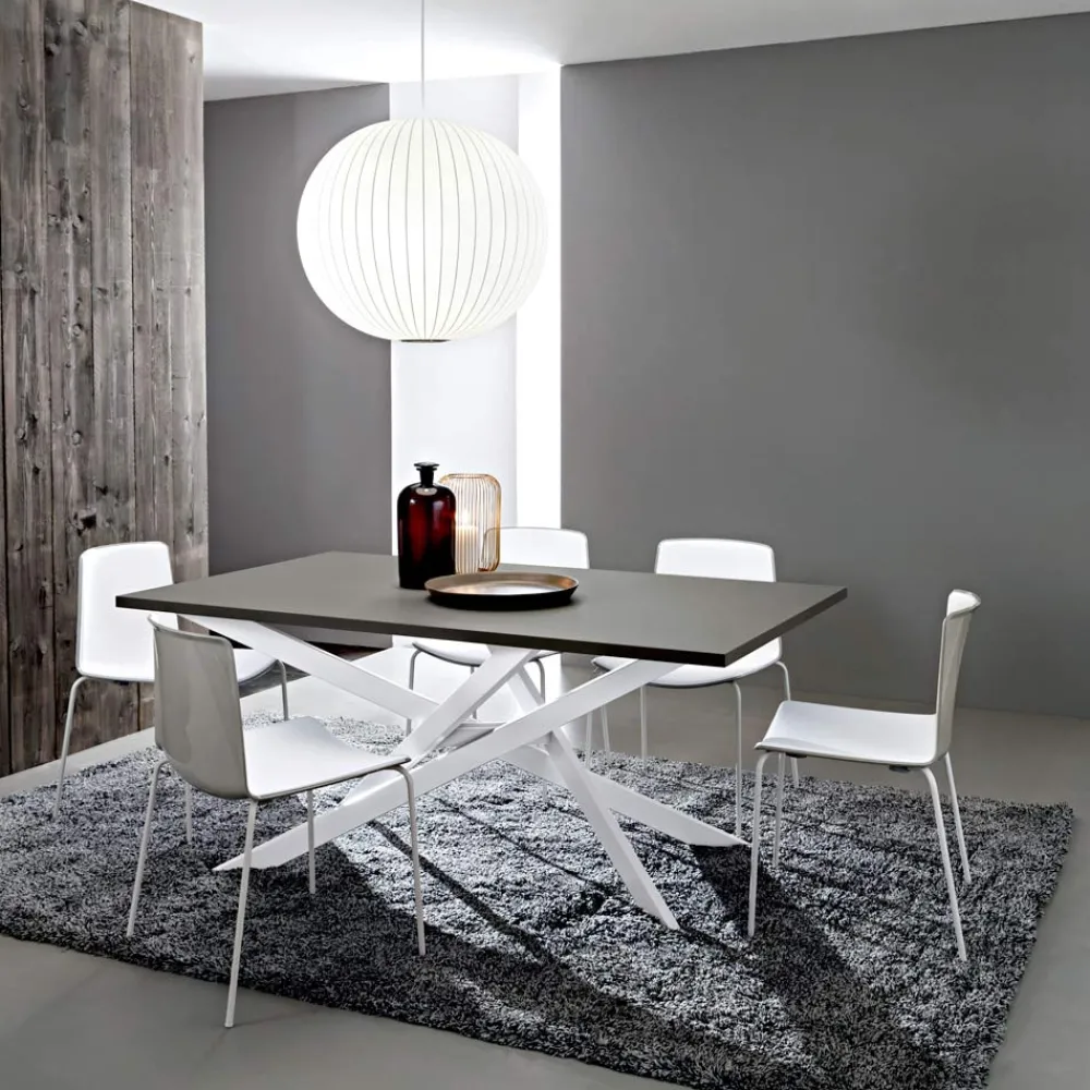 In Italien hergestellter Esstisch mit Platte aus Fenix und Basis aus mit weißem Epoxidpulver lackiertem Metall . Ein Möbelstück mit einer einfachen und vielseitigen Seele, dessen Design durch die besondere Form der Beine bereichert und einzigartig gemacht wird, die dank der ungewöhnlichen Flechtform dem Tisch seine wahre moderne und exklusive Persönlichkeit verleihen. Die wählbare Nuance der Basis macht zudem jede Farbkombination perfekt und eignet sich somit ideal für die unterschiedlichsten modernen Einrichtungssituationen, in die sie sich perfekt einfügt und der Umgebung eine innovative und edle Note verleiht. Auf optischer Ebene ist seine Besonderheit die geschichtete Fenix-Platte, die durch die Verwendung innovativer Harze eine widerstandsfähige, angenehm anzufassende und extrem undurchsichtige Oberfläche bietet, Elemente, die nicht nur die funktionale Seite des Tisches erhöhen, sondern auch unterstreichen und vervollständigen die ‚Ästhetik.