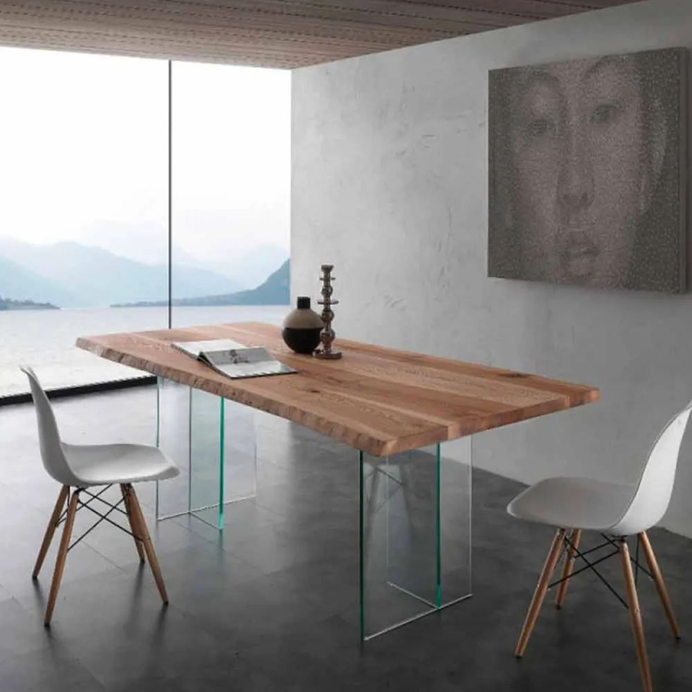 Die „warme“ Tischplatte ist aus Massivesche, mit unverarbeiteter Erscheinung und stellt sich dem „kälteren“ transparentem Glasgestell gegenüber.
