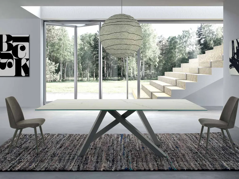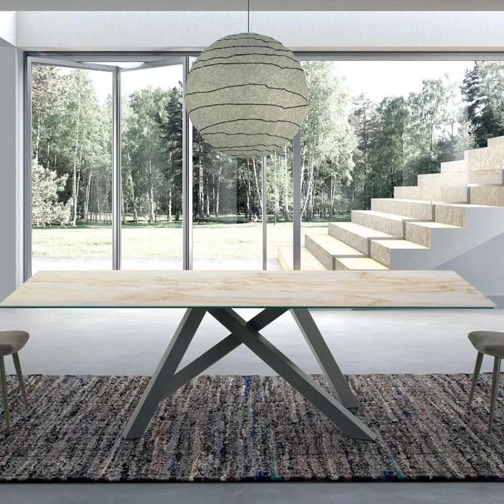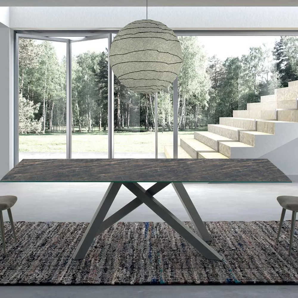 Tisch mit Keramikplatte und taubengrauem Stahlgestell in modernem Design, hergestellt in Italien.