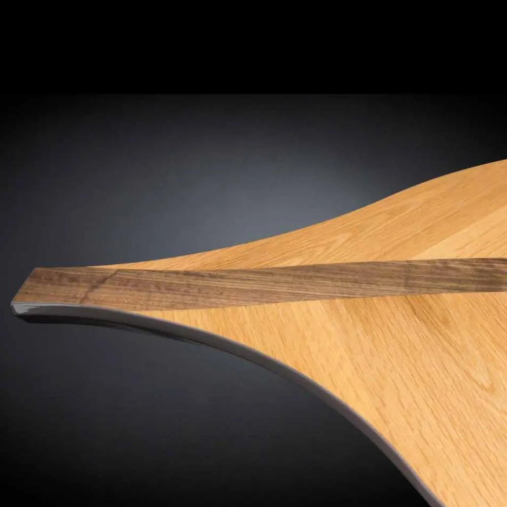 Die Tischplatte ist aus MDF mit Furnierholz Eiche und Nuss. Endbearbeitung mit verglastem Polyester.