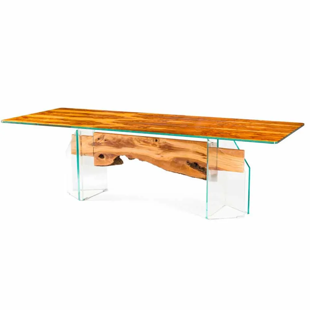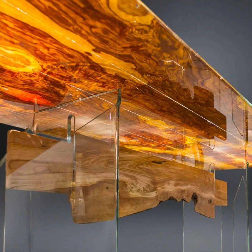 Der Tisch Portofino besteht aus zwei Glasschichten 10+10 mm. Dazwischen befindet sich Olivenholz.