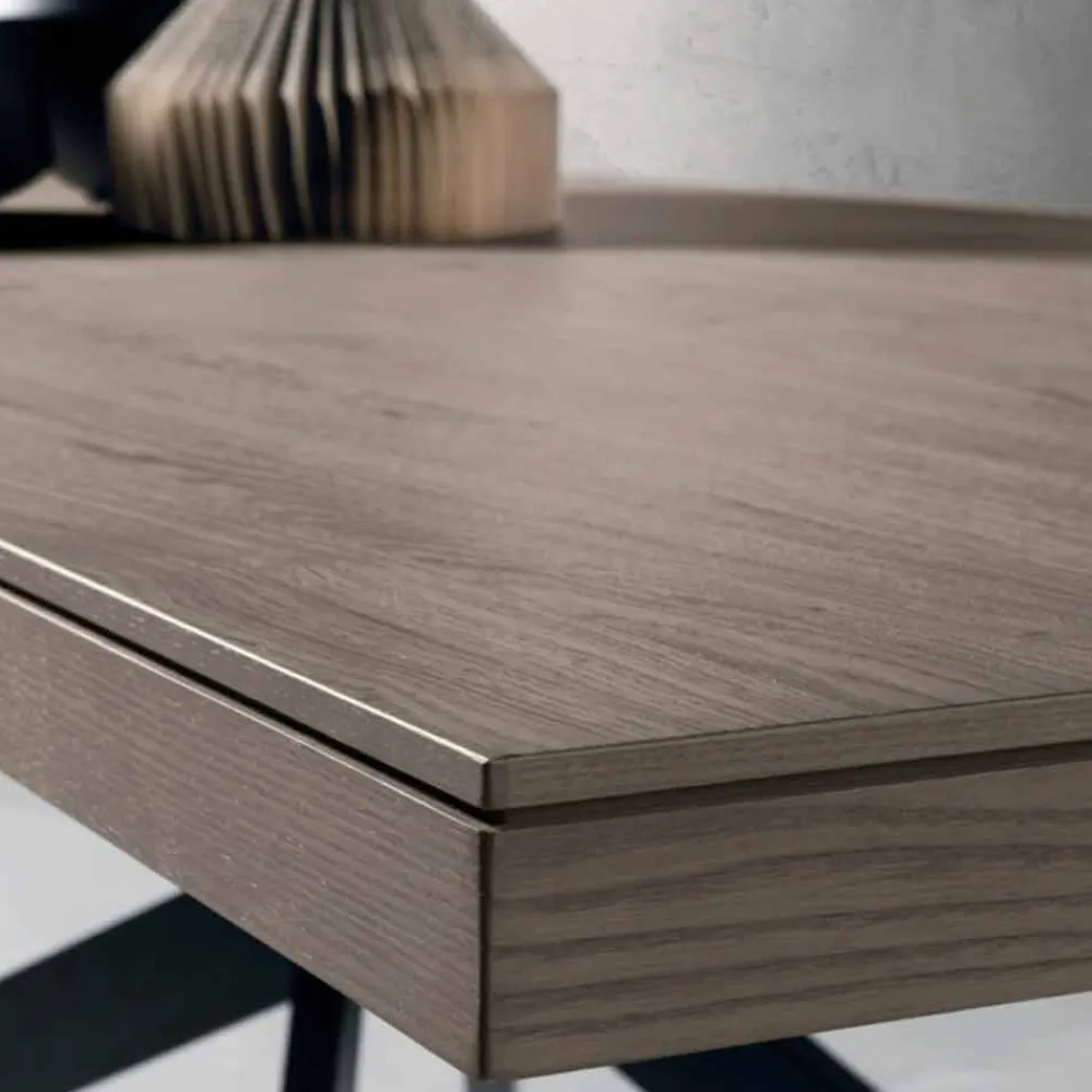 Die Platte hat eine Stärke von 18+42 mm und besteht aus geknotetem Eichenfurnier; aus der zentralen Gleitschiene lassen sich die 3 im Rahmen enthaltenen Verlängerungen von jeweils 45 cm herausziehen.