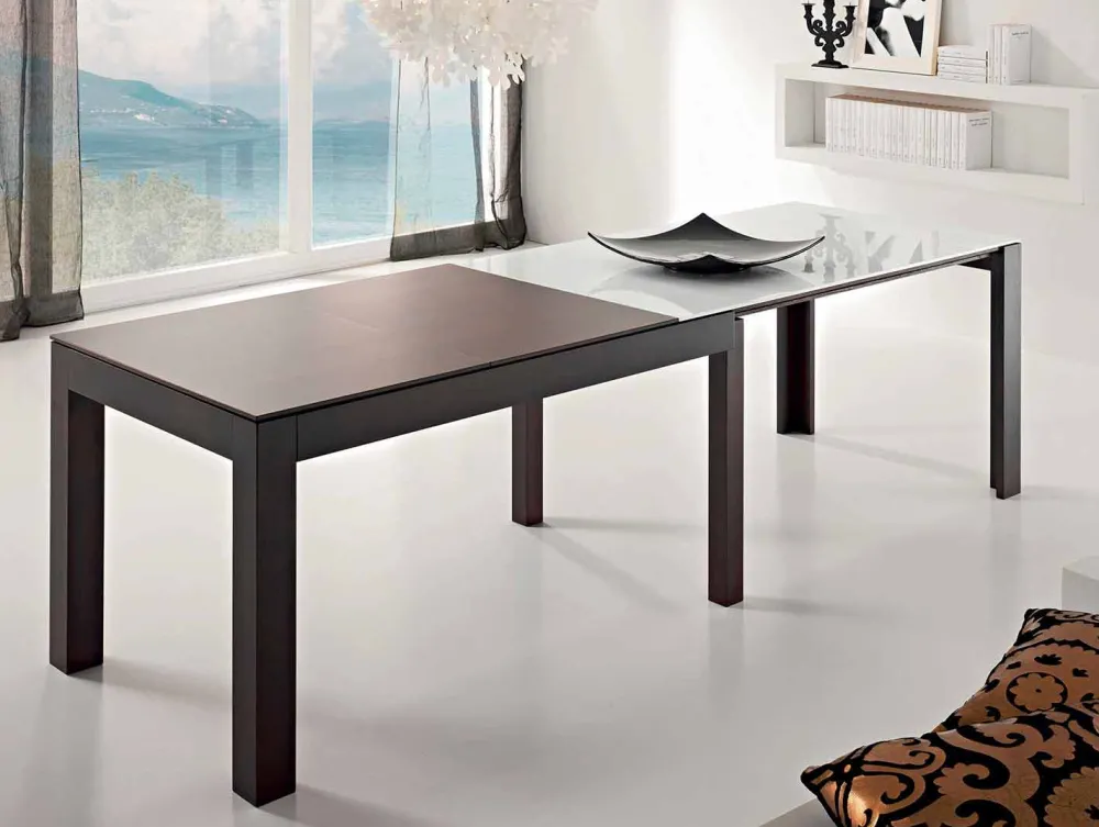 Ausziehbarer Esstisch mit modernem Design, extra klarer Milchglasplatte und Eschenholzboden, hergestellt in Italien.