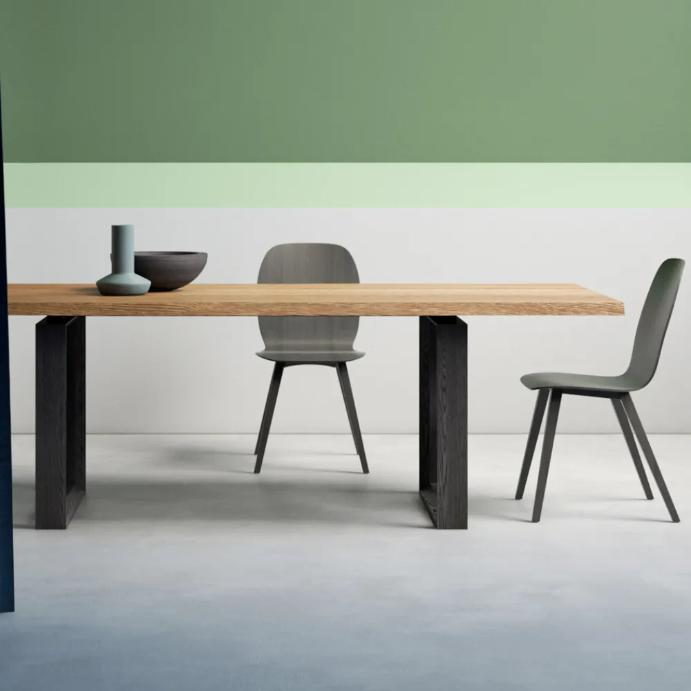 Ausziehbarer Tisch mit abgeschrägter Platte aus natürlichem Eichenfurnier auf Pappelspanplatte und entrindeter Kante. Beine aus furniertem und abgeschrägtem Massivholz, lackiert in Räuchereiche. Im Lieferumfang sind 2 Verlängerungen von jeweils 50 cm enthalten, eine unter dem Tisch und die andere außen.